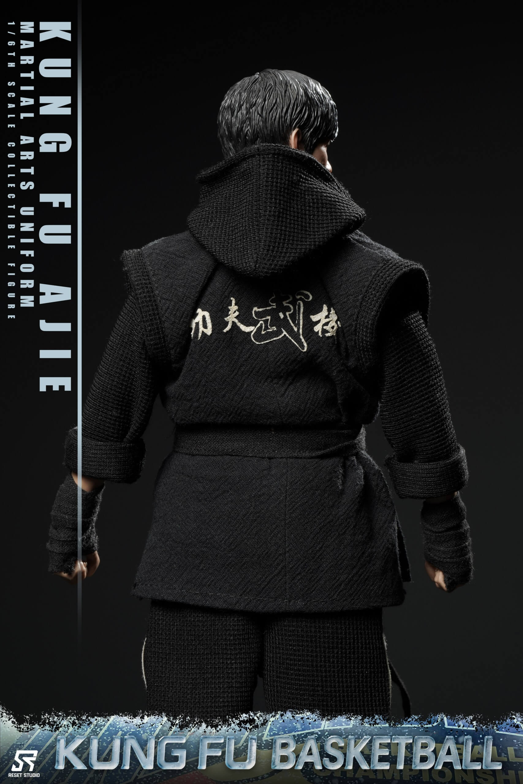 - Full textile martial arts uniform — structured hooded vest over a long-sleeve wrap jacket, rendered in a textured woven fabric with visible weave detail; embroidered crest on chest and calligraphic characters across the back