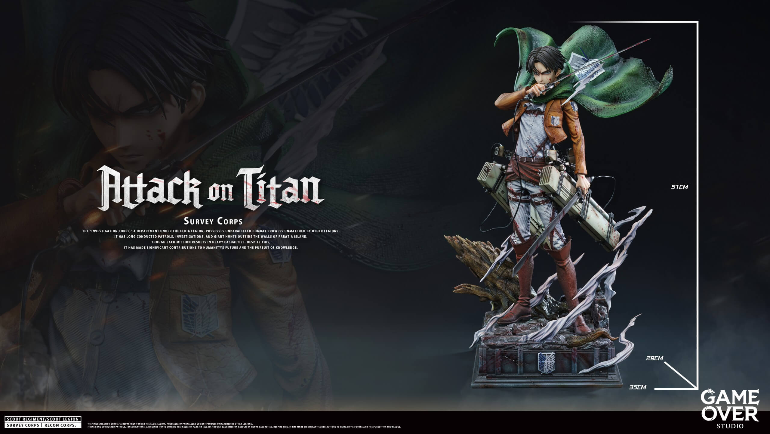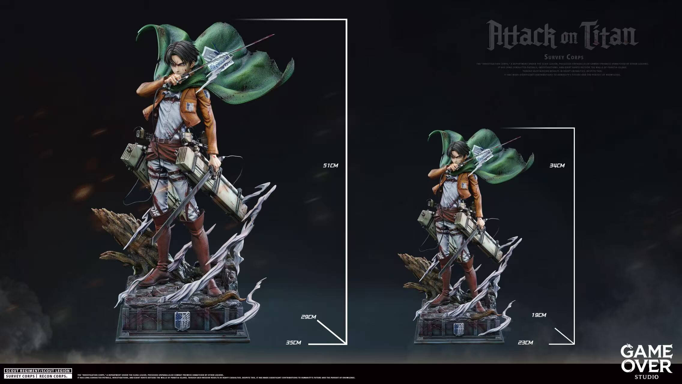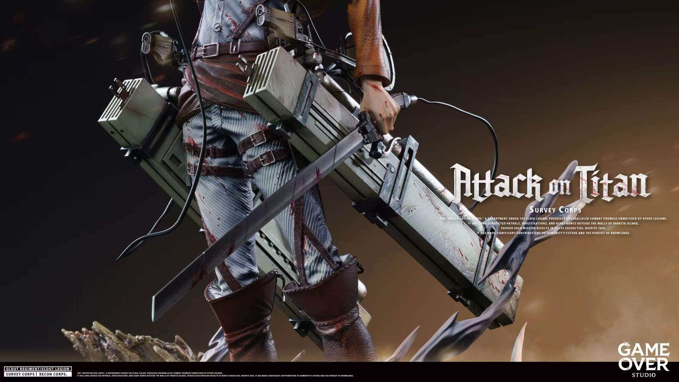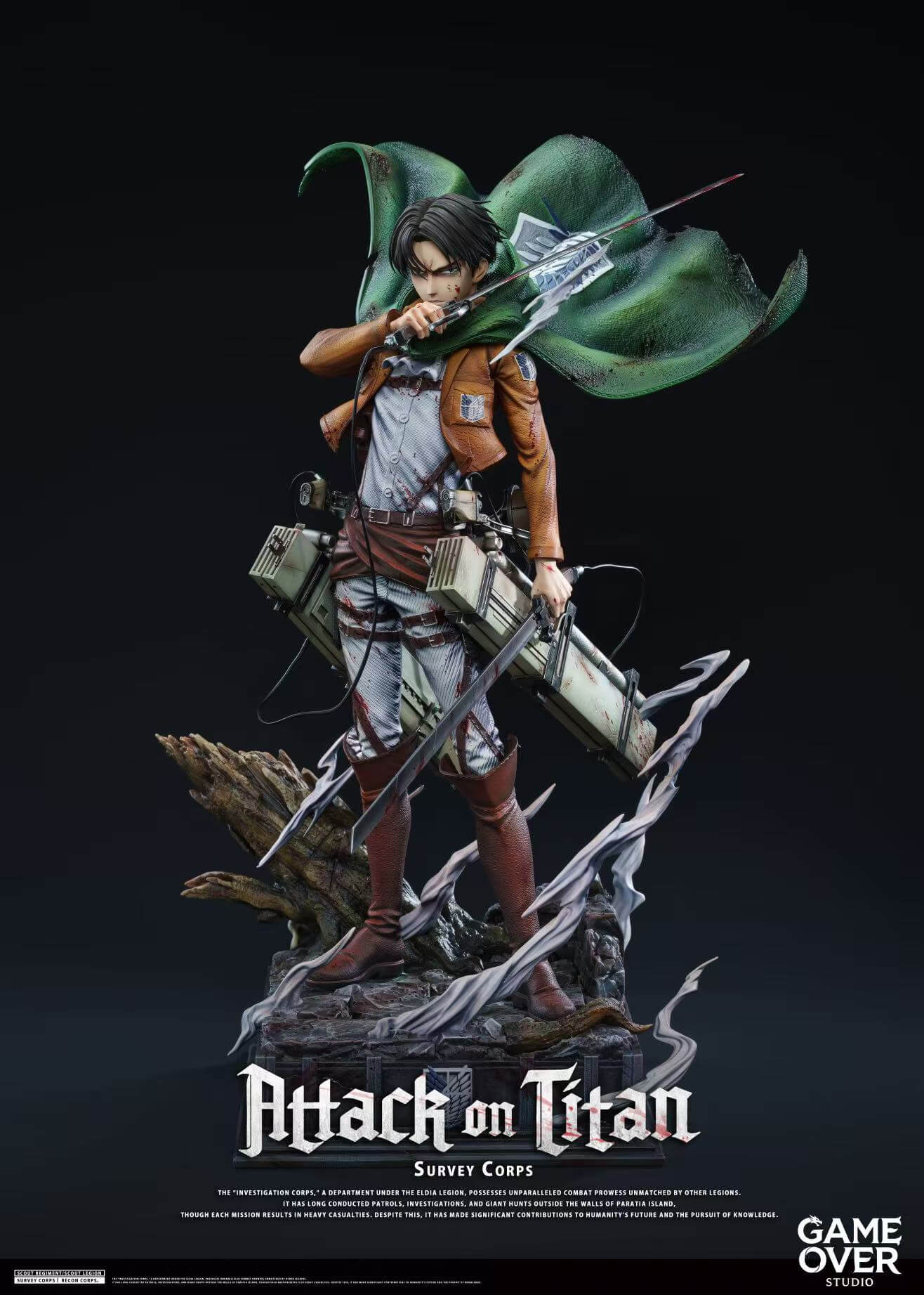 - Main figure body — Survey Corps uniform with sculpted ODM gear harness and dual Vertical Maneuvering Equipment gas canisters rendered in precise mechanical detail