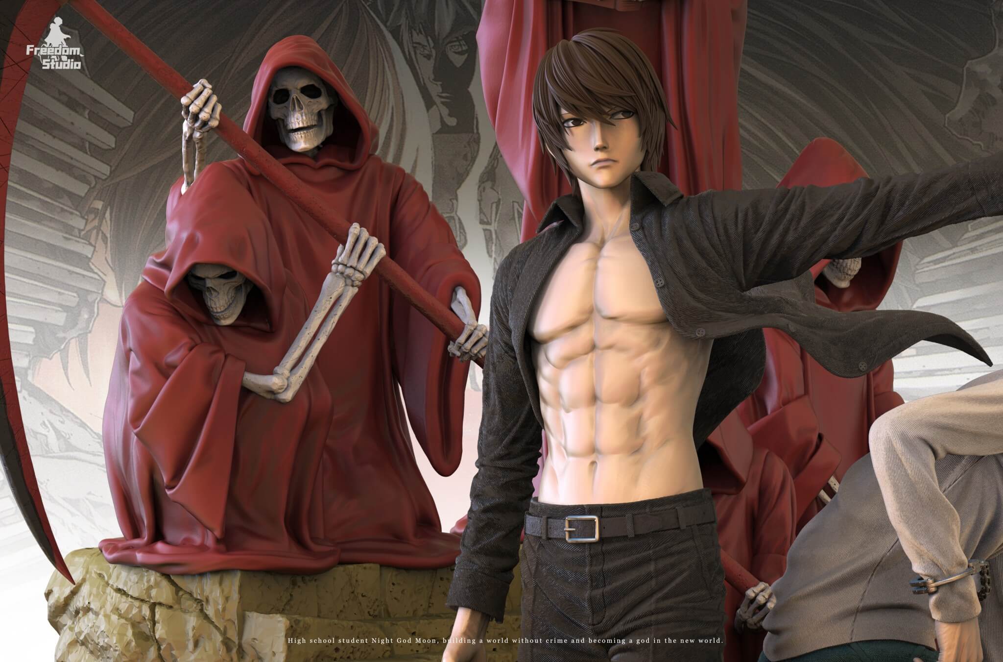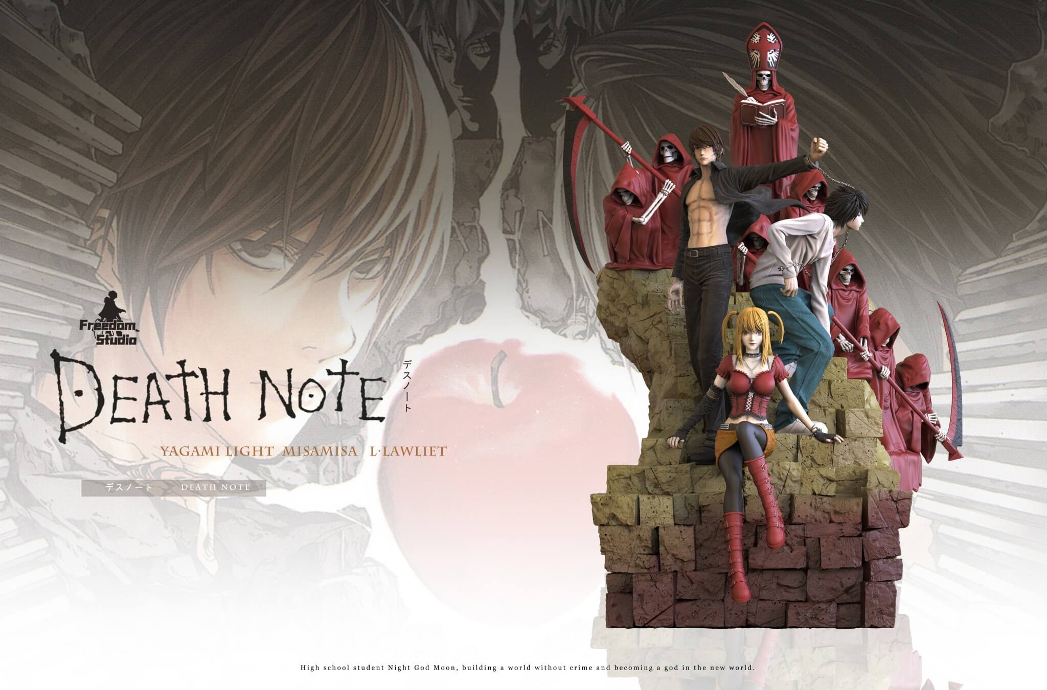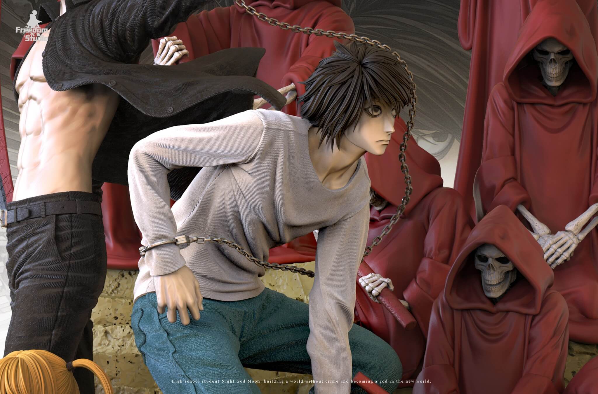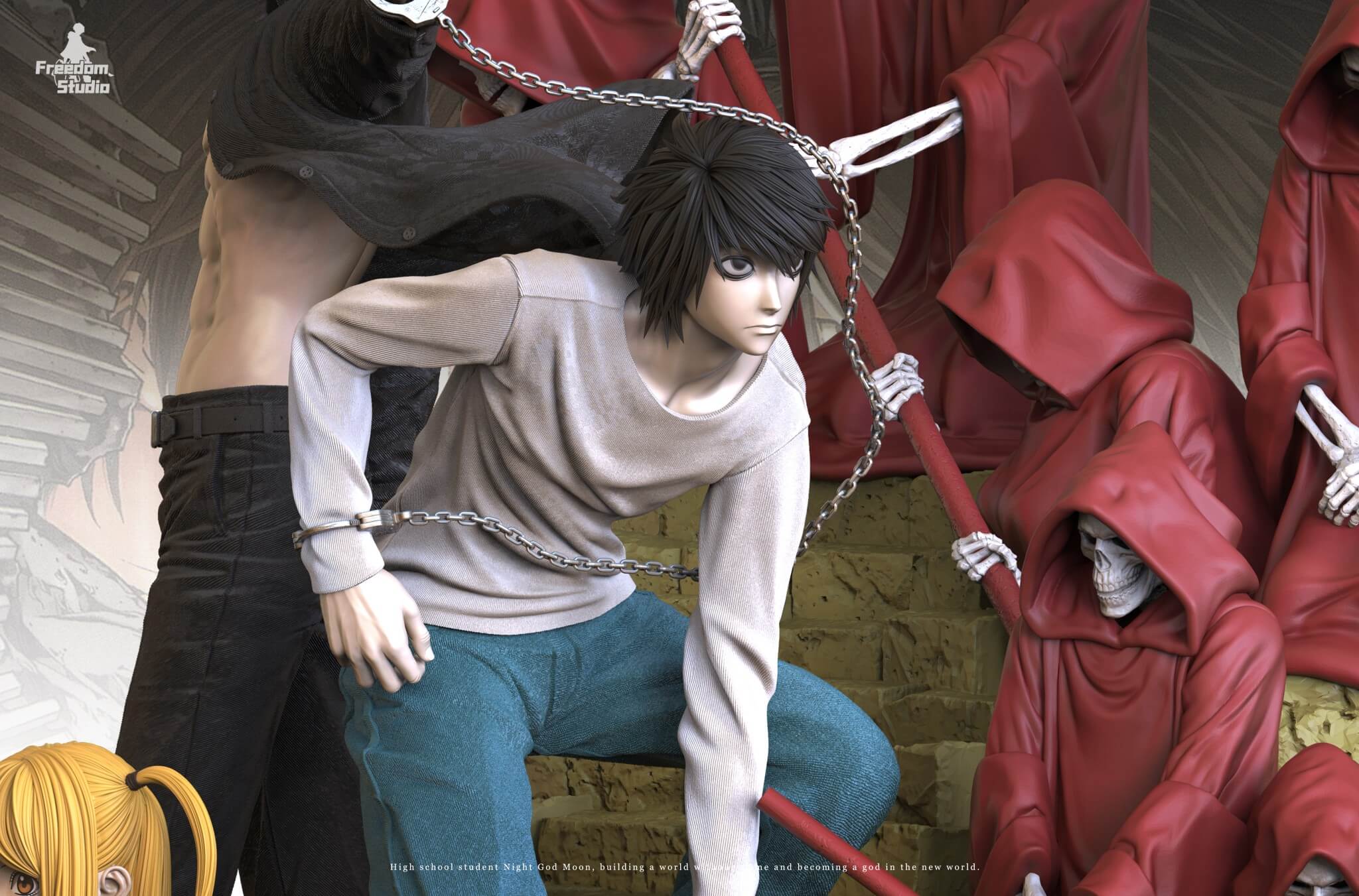 - Fully assembled scene featuring Light, L (linked by a sculpted chain), and Misa on a tiered ruin base