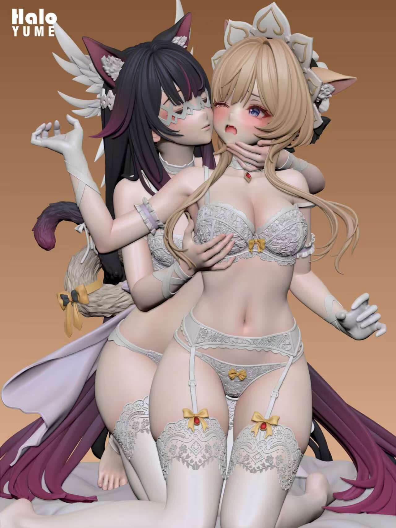 Sandrone (The Marionette) and Columbina (Damselette) are both members of the Eleven Fatui Harbingers in HoYoverse’s Genshin Impact. Introduced together during the Harbingers’ dramatic assembly following the death of La Signora, the two occupy opposite ends of the group’s temperament — Sandrone cold and mechanically precise, Columbina ethereal and deceptively gentle. This piece reimagines their dynamic through Halo Studio’s original interpretation, casting the pair in an intimate, playful encounter that contrasts Sandrone’s assertive grip with Columbina’s flushed vulnerability.