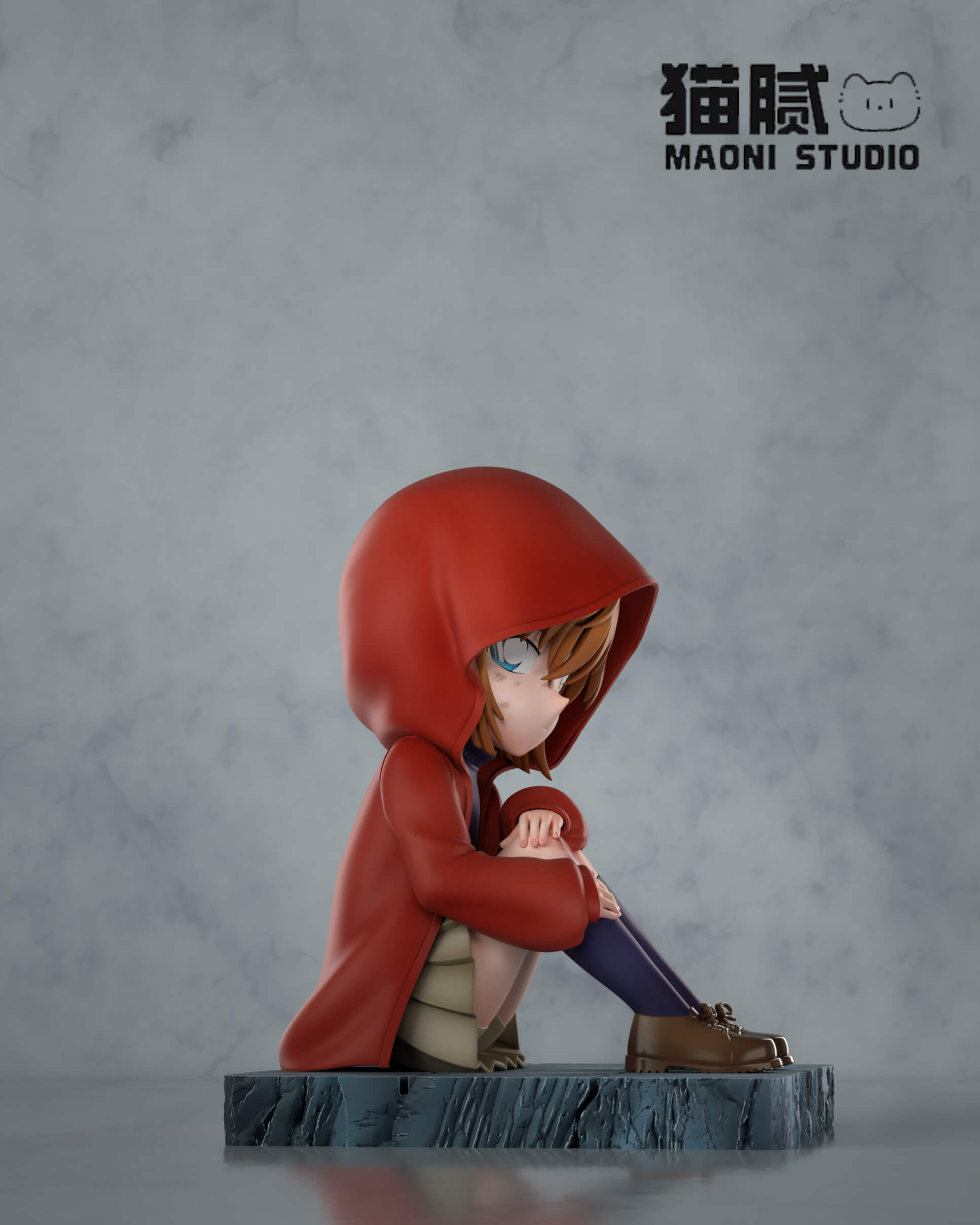 - Seated Ai figure in a red hooded cloak