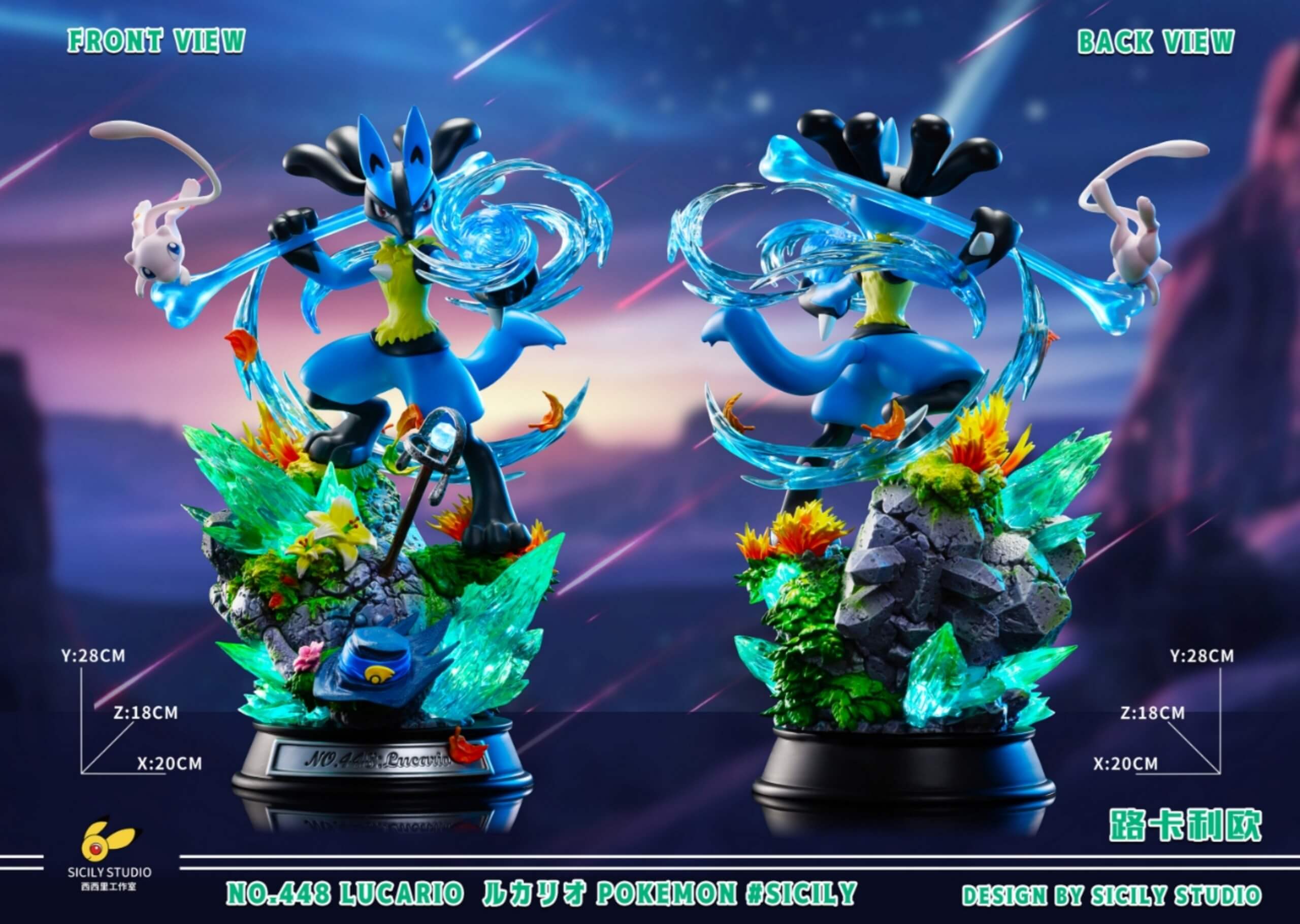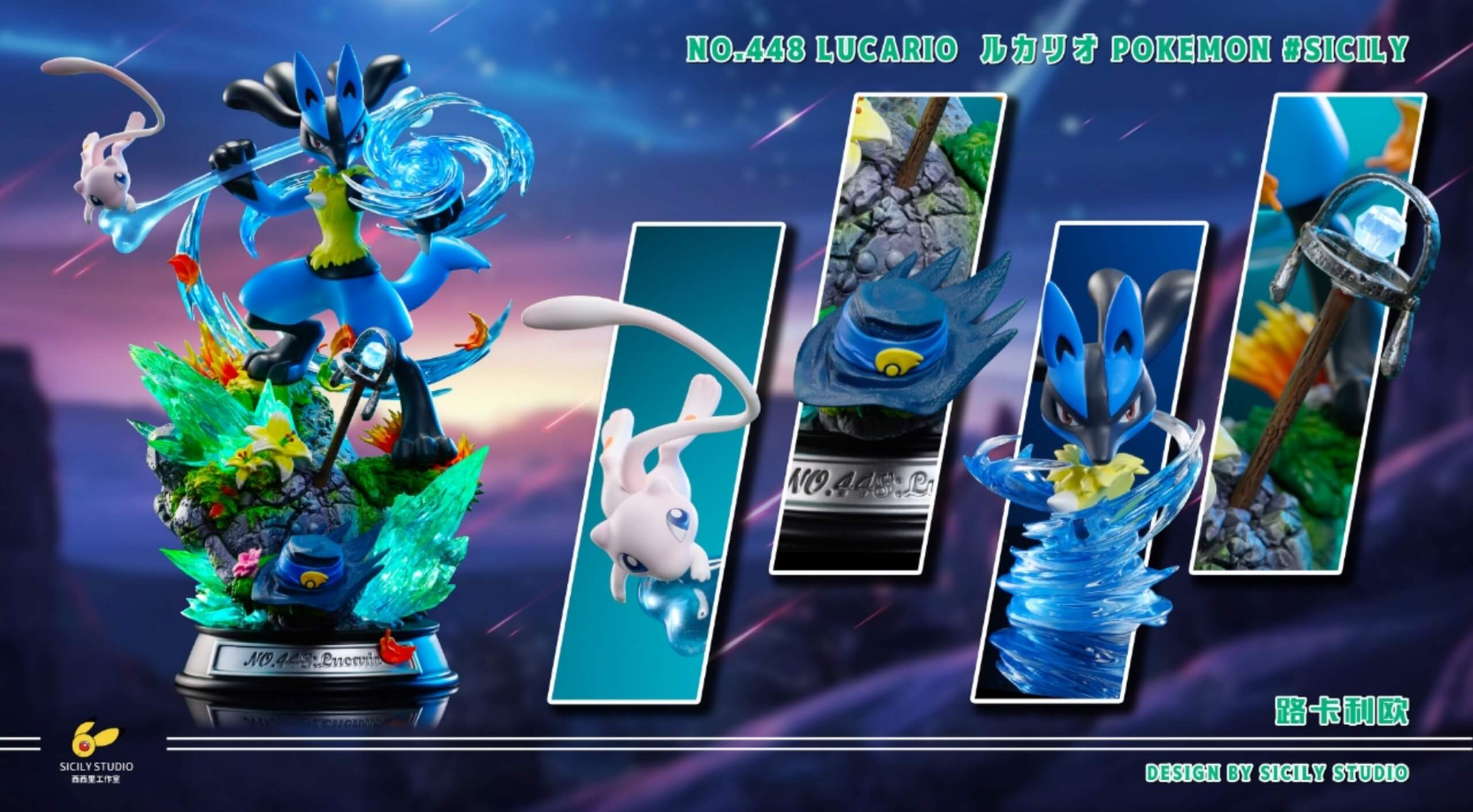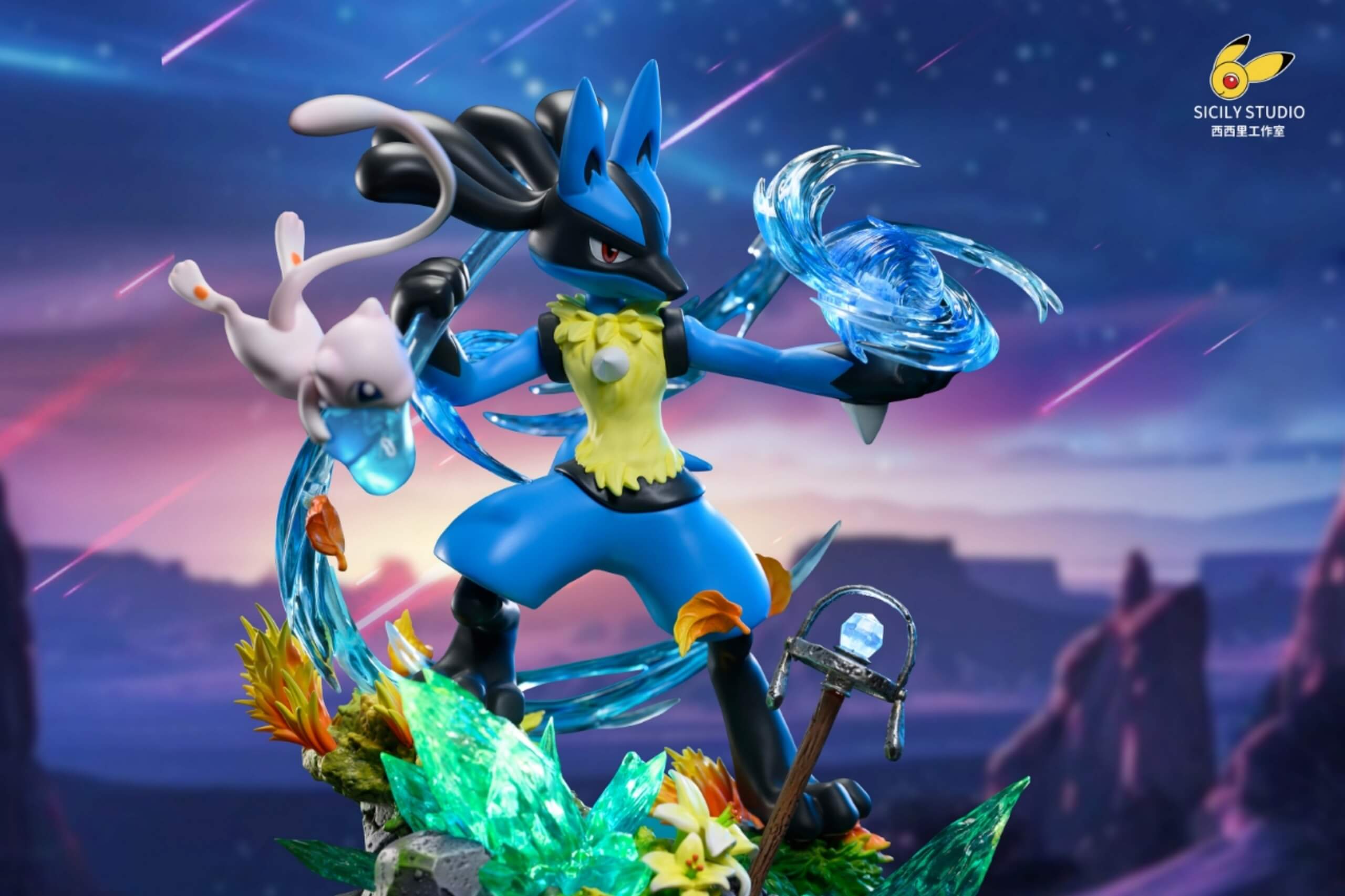 - Dynamic Lucario figure channeling an Aura Sphere