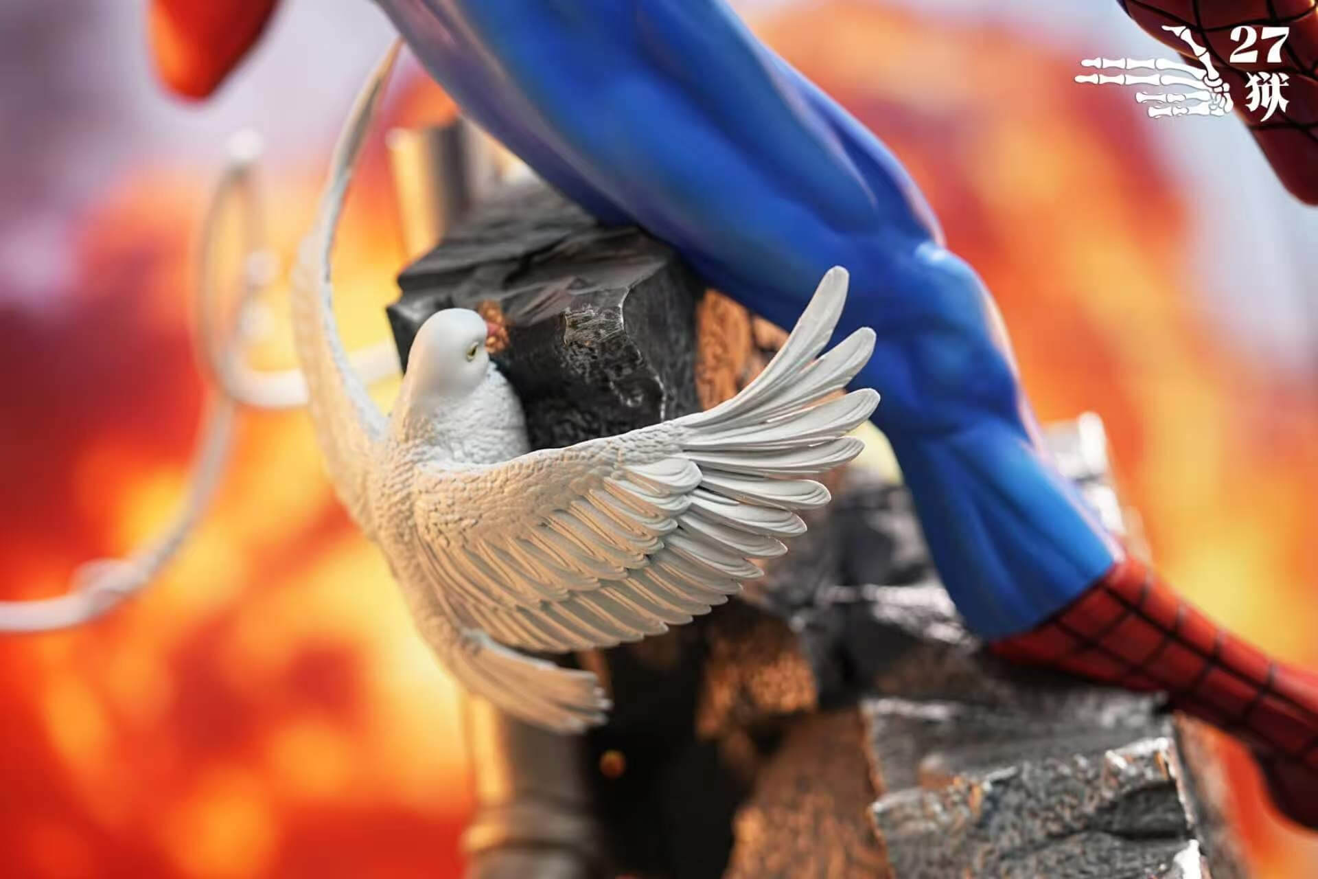 - Spider-Man figure with classic red-and-blue suit, perched mid-leap on shattered debris