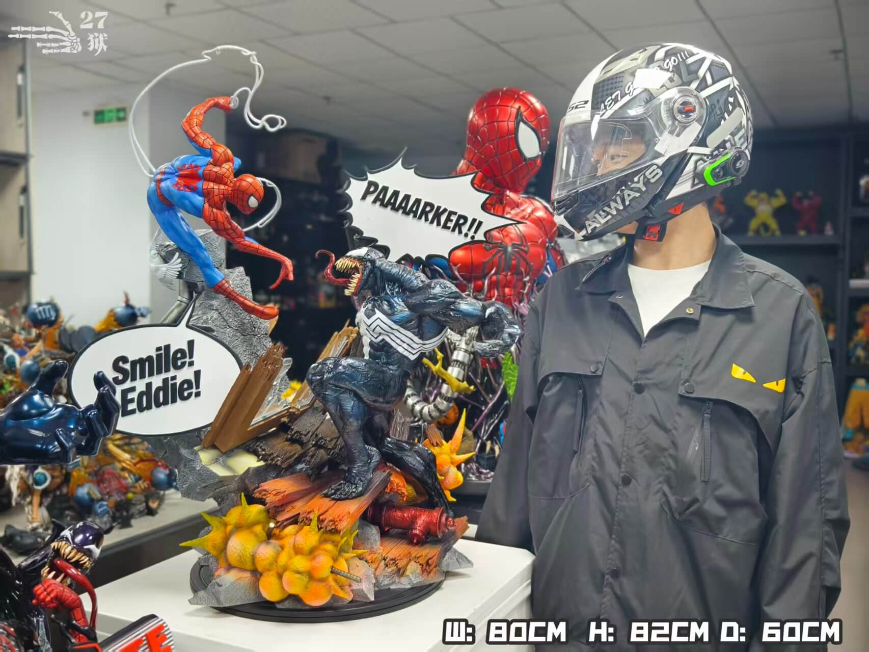 - Venom figure with partially peeled symbiote revealing Eddie Brock’s snarling face beneath