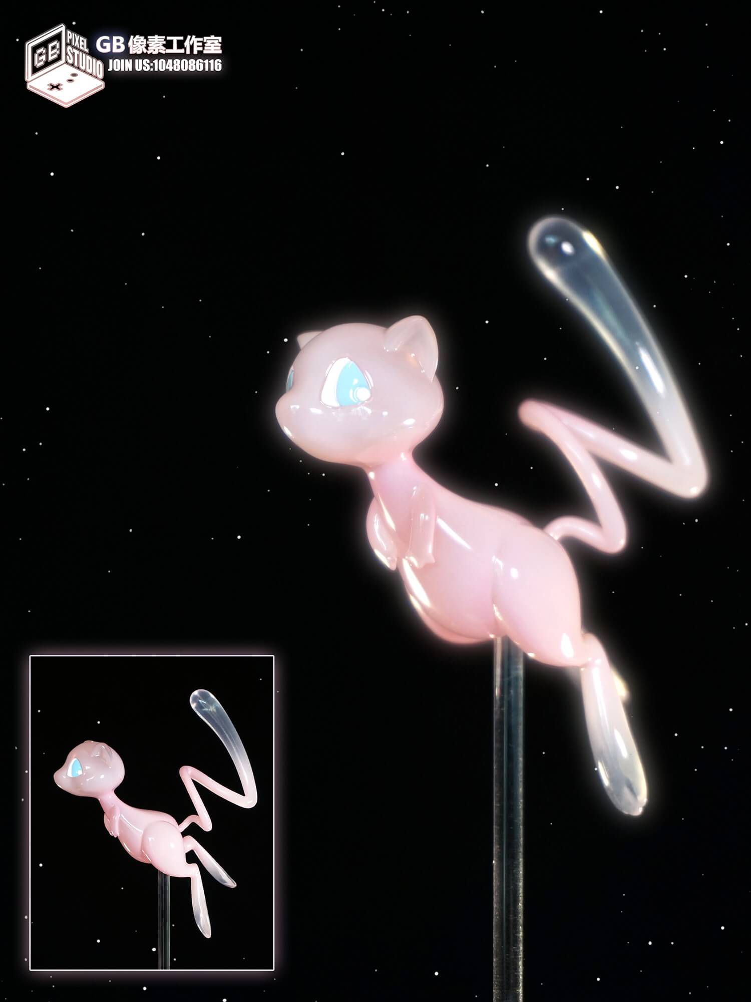 - Mew is rendered in semi-transparent, gradient-tinted resin for an ethereal appearance.