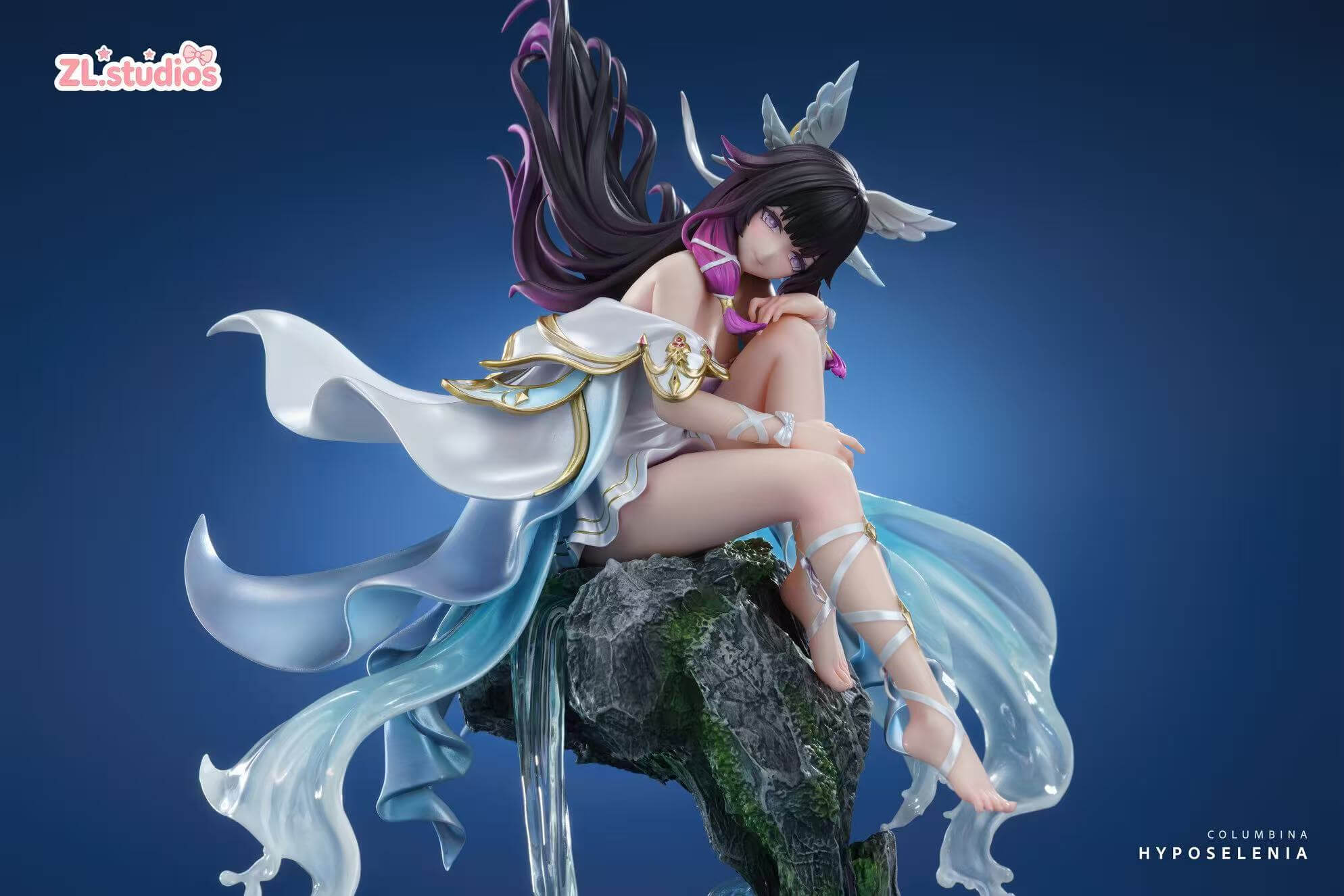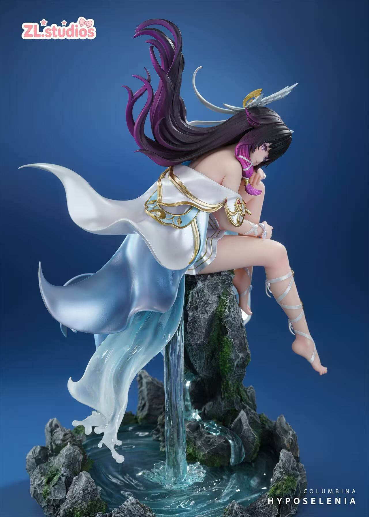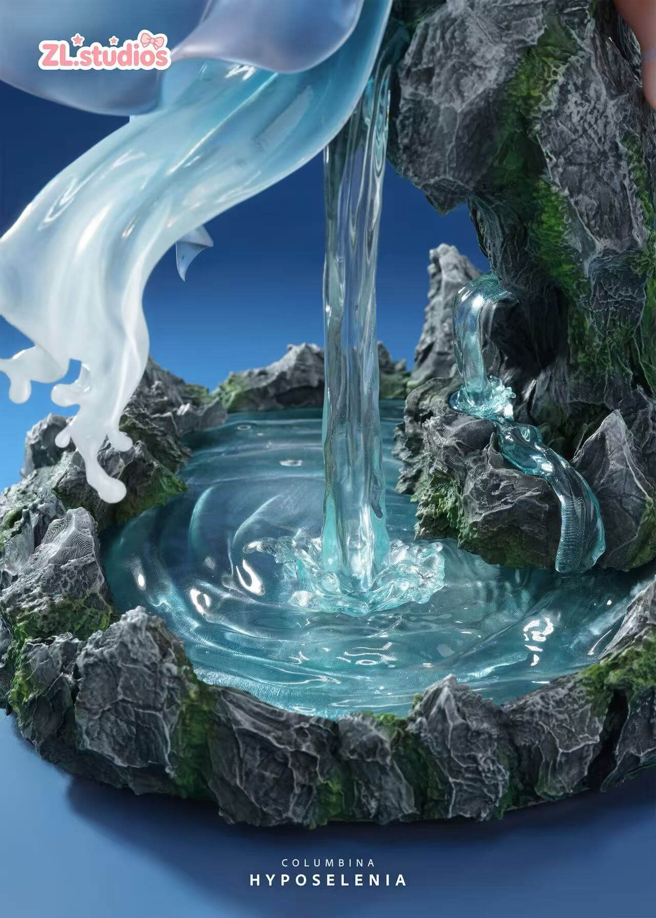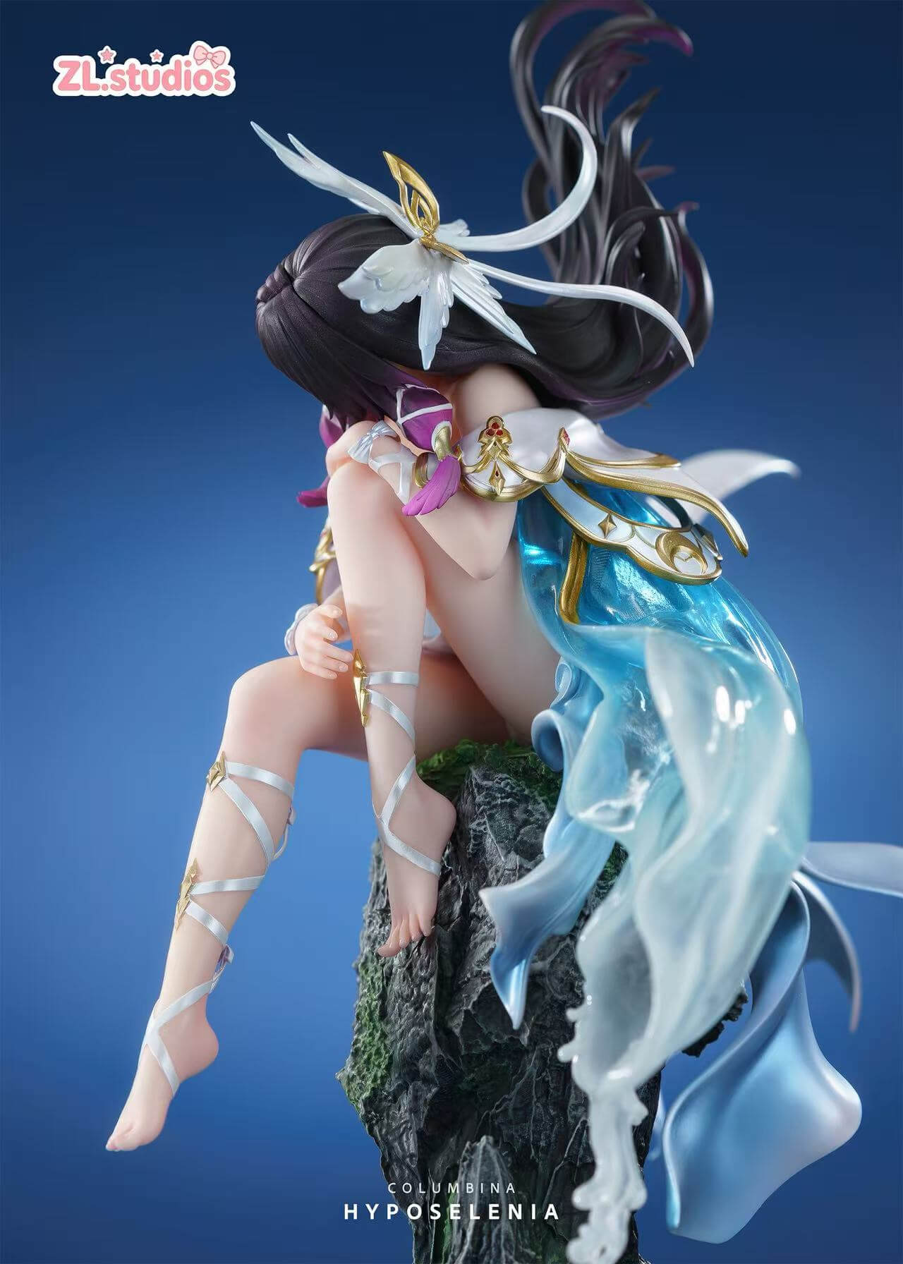 - Single unified sculpt โ Columbina perched atop a moss-covered rock formation, knees drawn in, gaze cast downward in quiet contemplation