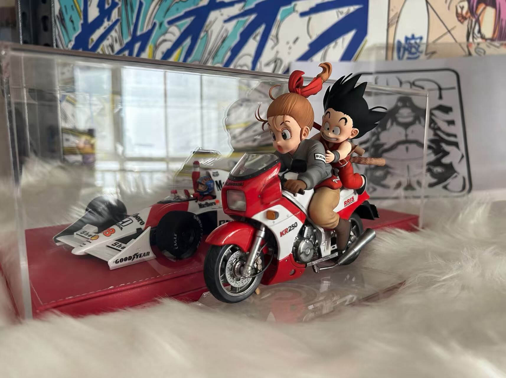 • Kid Goku figure — classic red gi, wide grin, tail visible, clinging to the back of the motorcycle with carefree energy