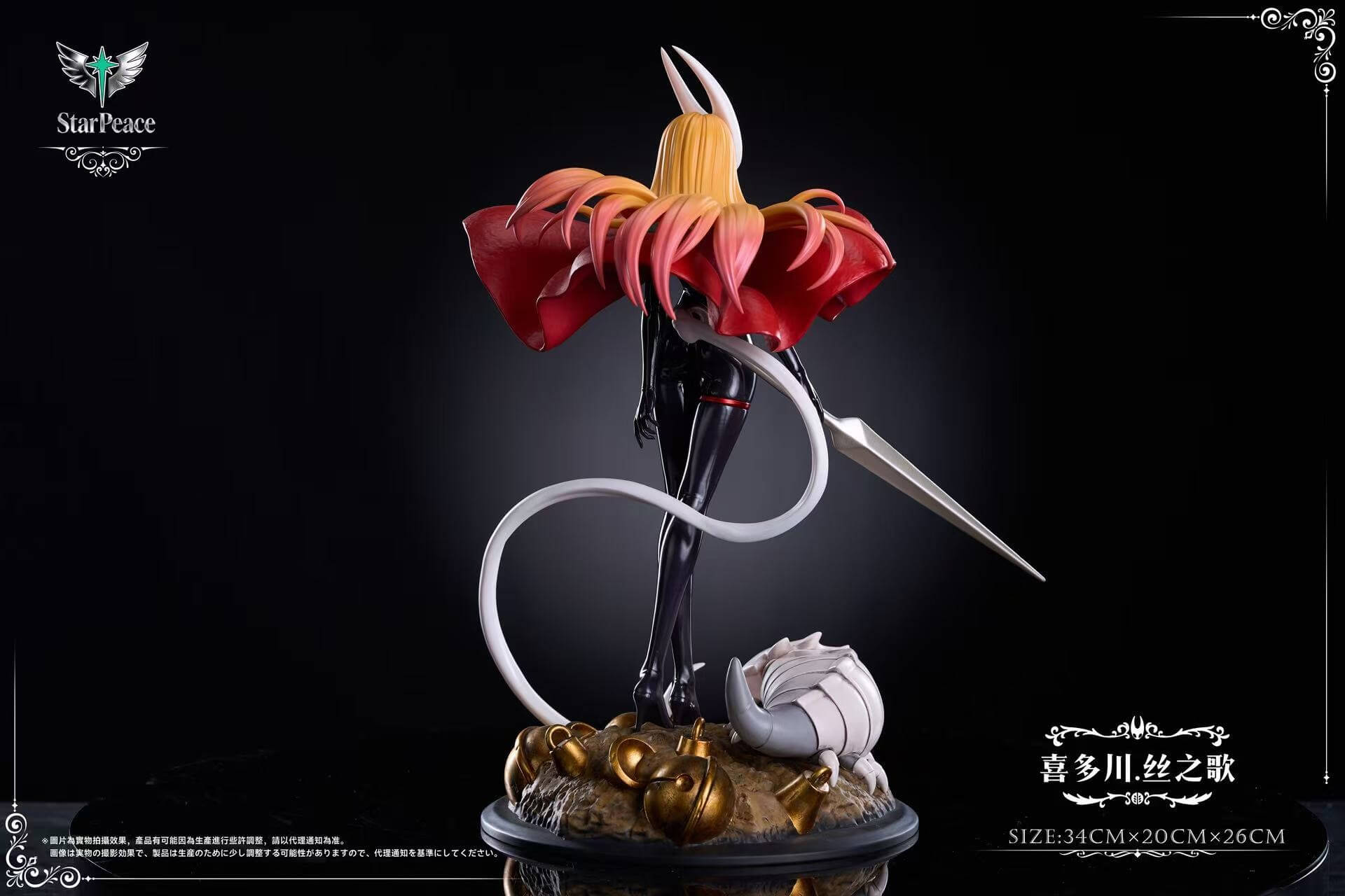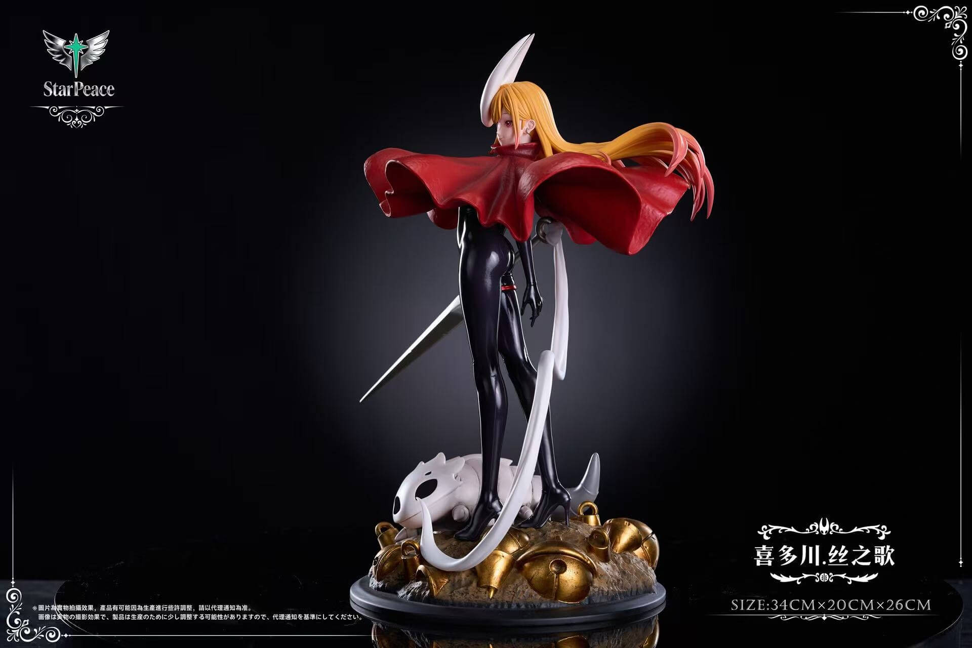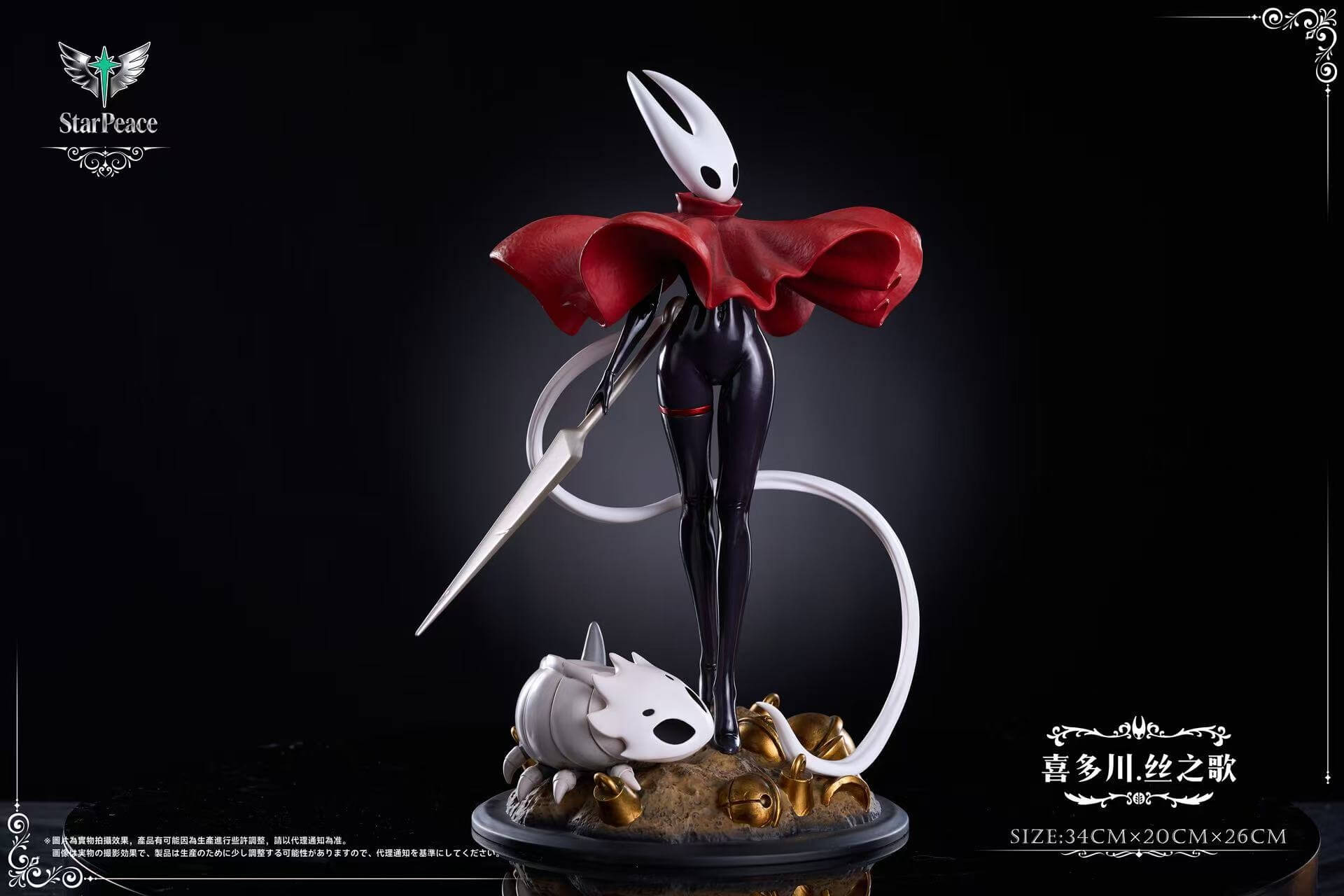 This piece is HSStudio × Star Peace’s original crossover interpretation, reimagining Marin Kitagawa from My Dress-Up Darling fully cosplaying as Hornet from Team Cherry’s Hollow Knight universe. The statue channels Marin’s boundless cosplay passion — her sleek dark shell-like bodysuit, billowing crimson cloak, and slender needle weapon faithfully recreate Hornet’s silhouette, while the adorable Grub resting at her feet anchors the scene squarely in the world of Hallownest. It’s the kind of ambitious costume project Marin would throw herself into heart-first, and the sculptors have matched that energy beautifully.