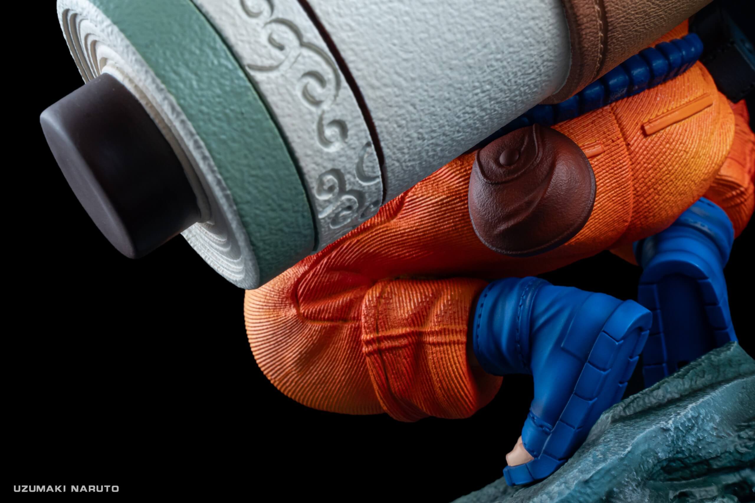 - Features Naruto crouched atop a textured whirlpool stone base, tongue out and forming the “Shadow Clone” hand-seal while hefting the giant mission scroll.