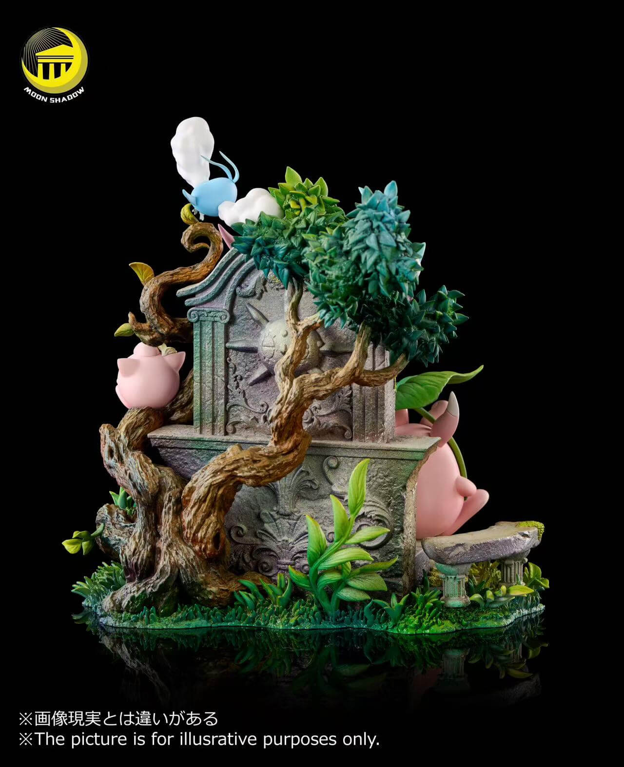 - Jigglypuff perched to the right on a gnarled tree root, flower accessory in hair
