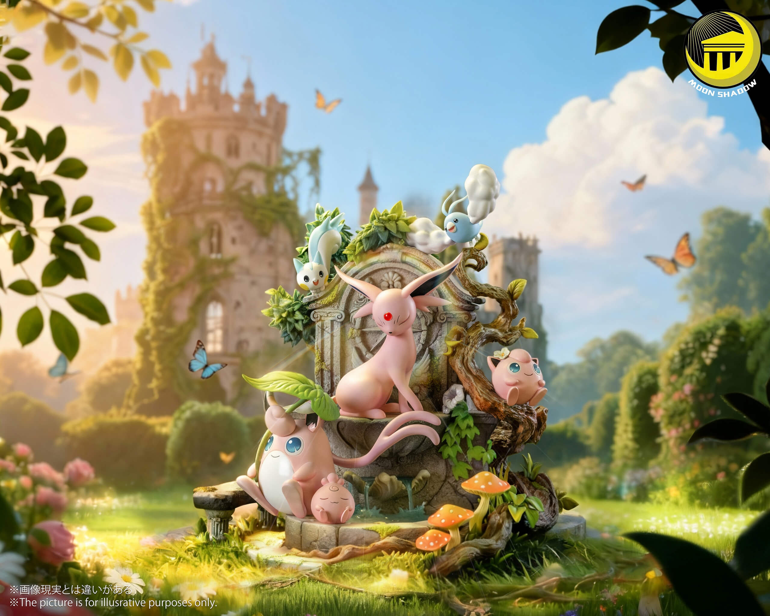 - Full ensemble scene featuring Espeon as the centerpiece, posed with quiet elegance atop a mossy stone fountain