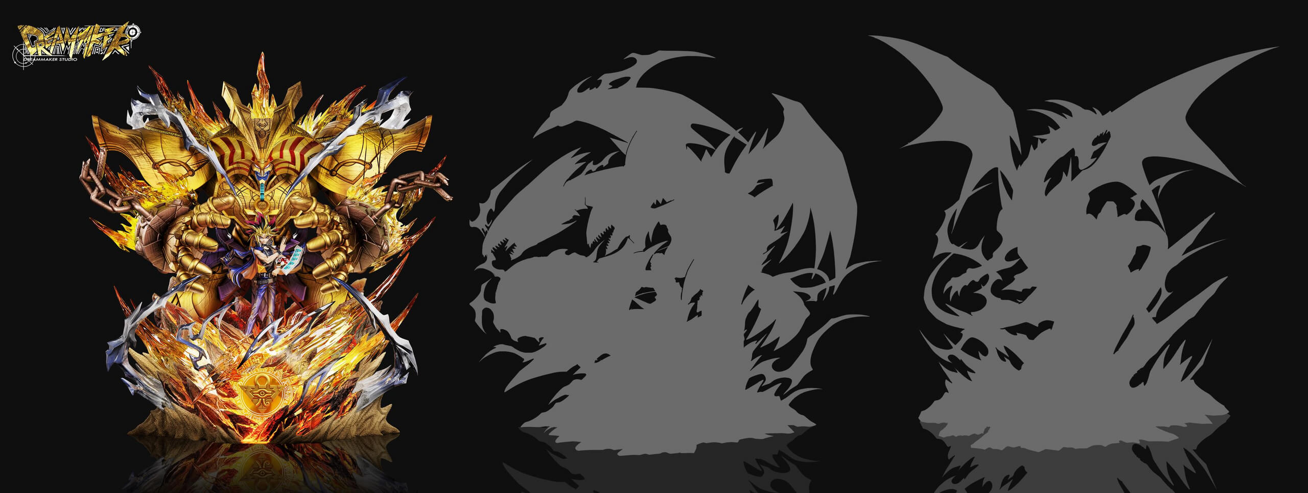 - Main figure (Yugi Muto / Atem) โ posed mid-duel, cards in hand, standing at the base of Exodia’s summoning eruption