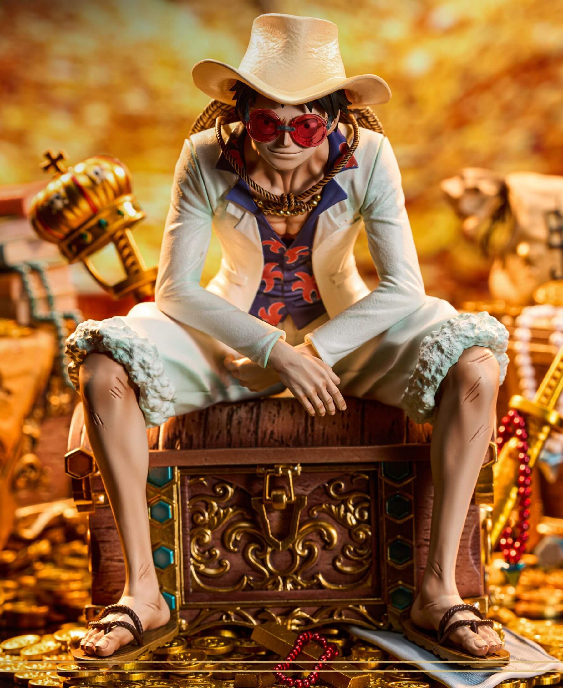 - Captures Monkey D. Luffy in his iconic attire from One Piece Film: Gold, seated confidently atop a treasure chest.
