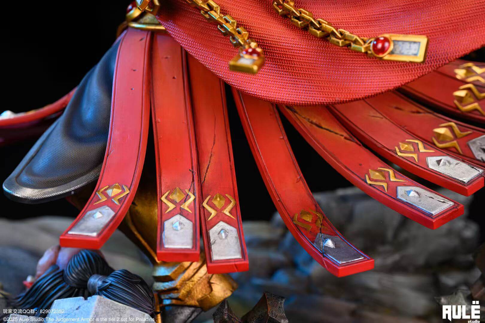 - A flowing, gold-trimmed cape is sculpted with a fine, realistic fabric texture.