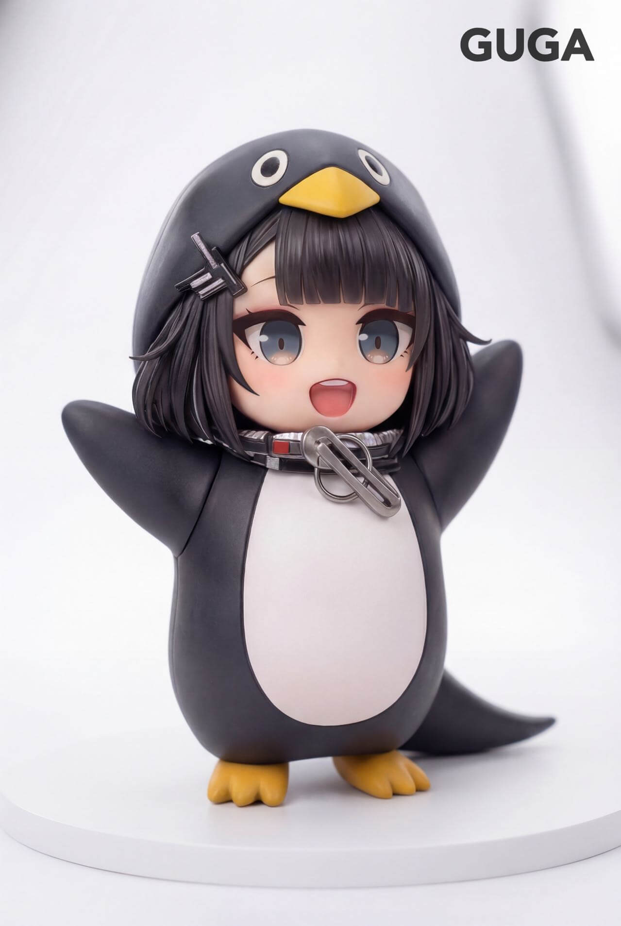 - Full figure in penguin kigurumi costume — arms raised in a cheerful waddling pose, capturing a moment of unguarded delight