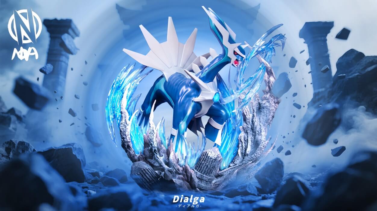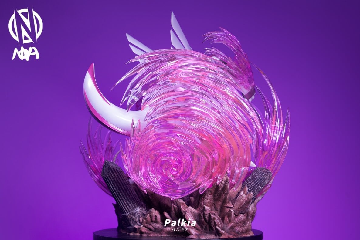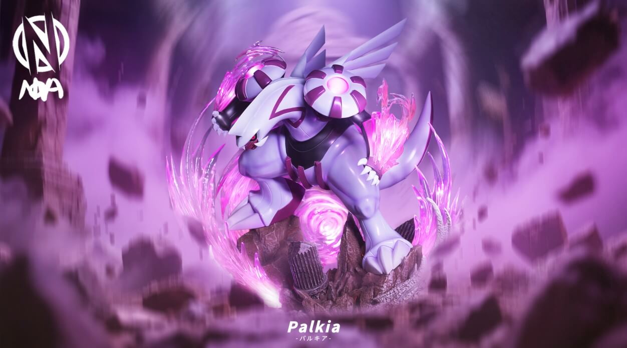 - Dynamic translucent energy effects surround each Pokémon (cascading blue for Dialga, spiraling pink for Palkia).