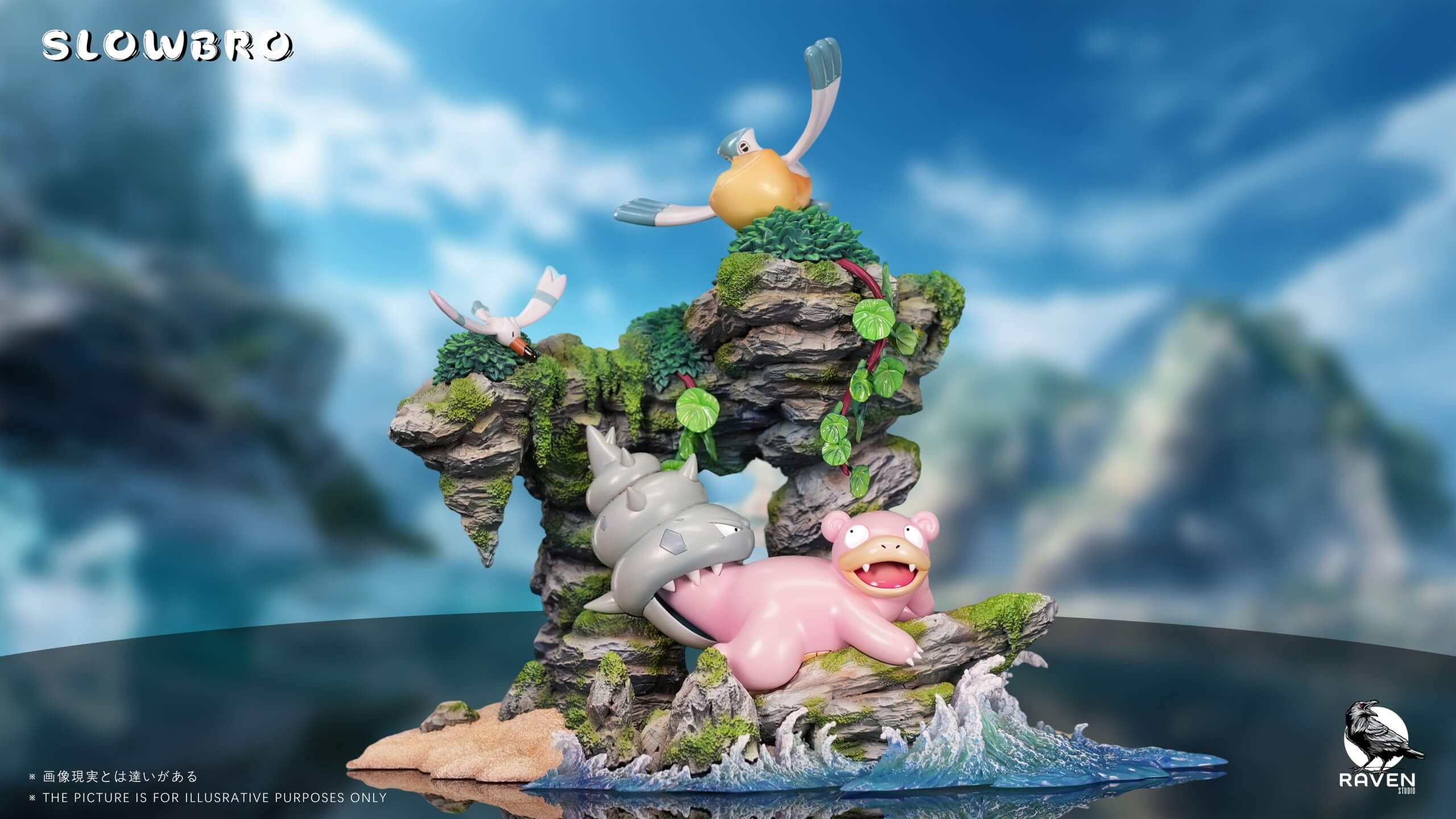 - Features Slowpoke on a scenic rocky seaside base with dynamic wave effects.