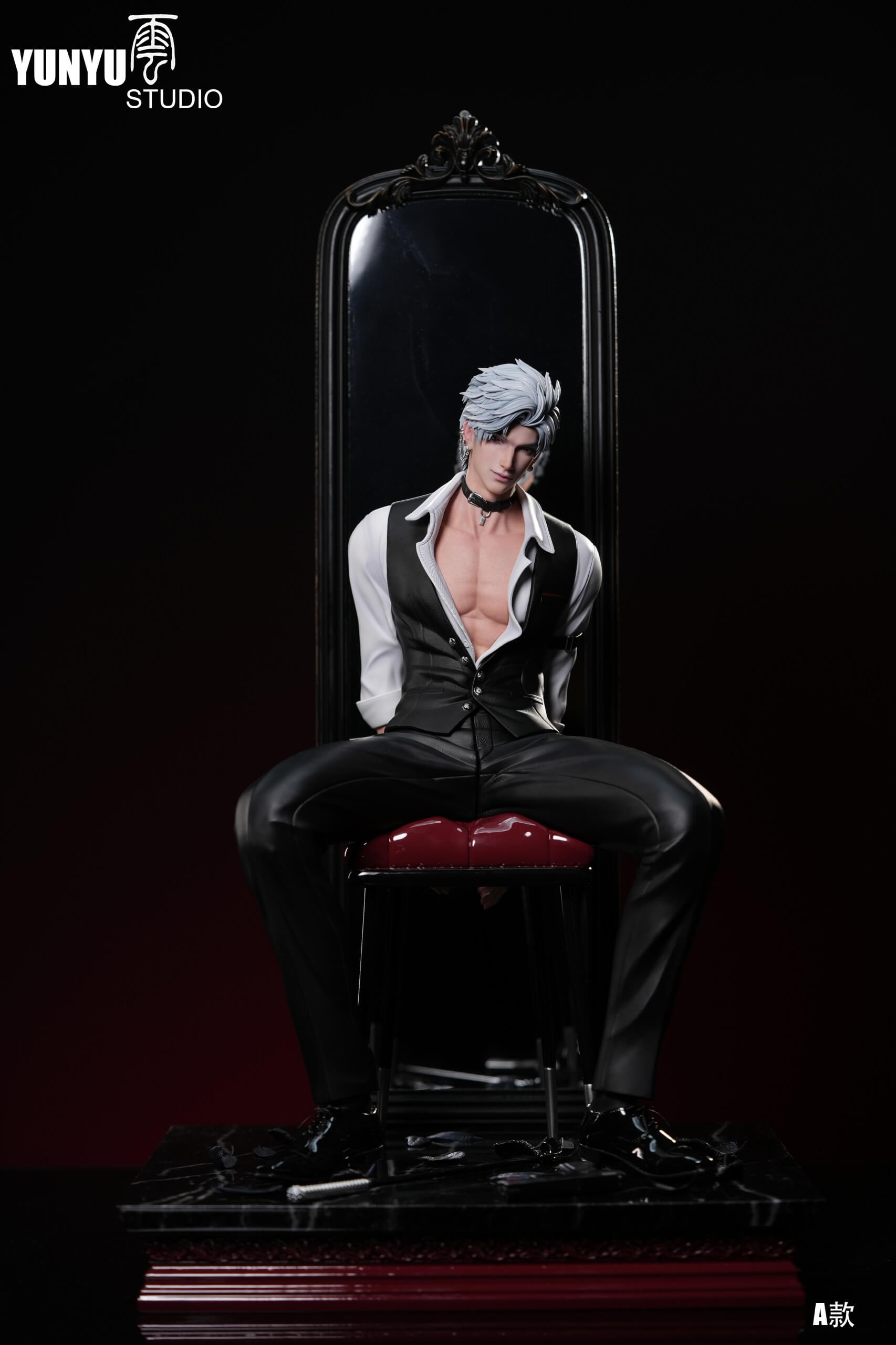 - Version A (Unrestrained Suit): Features the figure in a full black three-piece suit with an open chest design.
