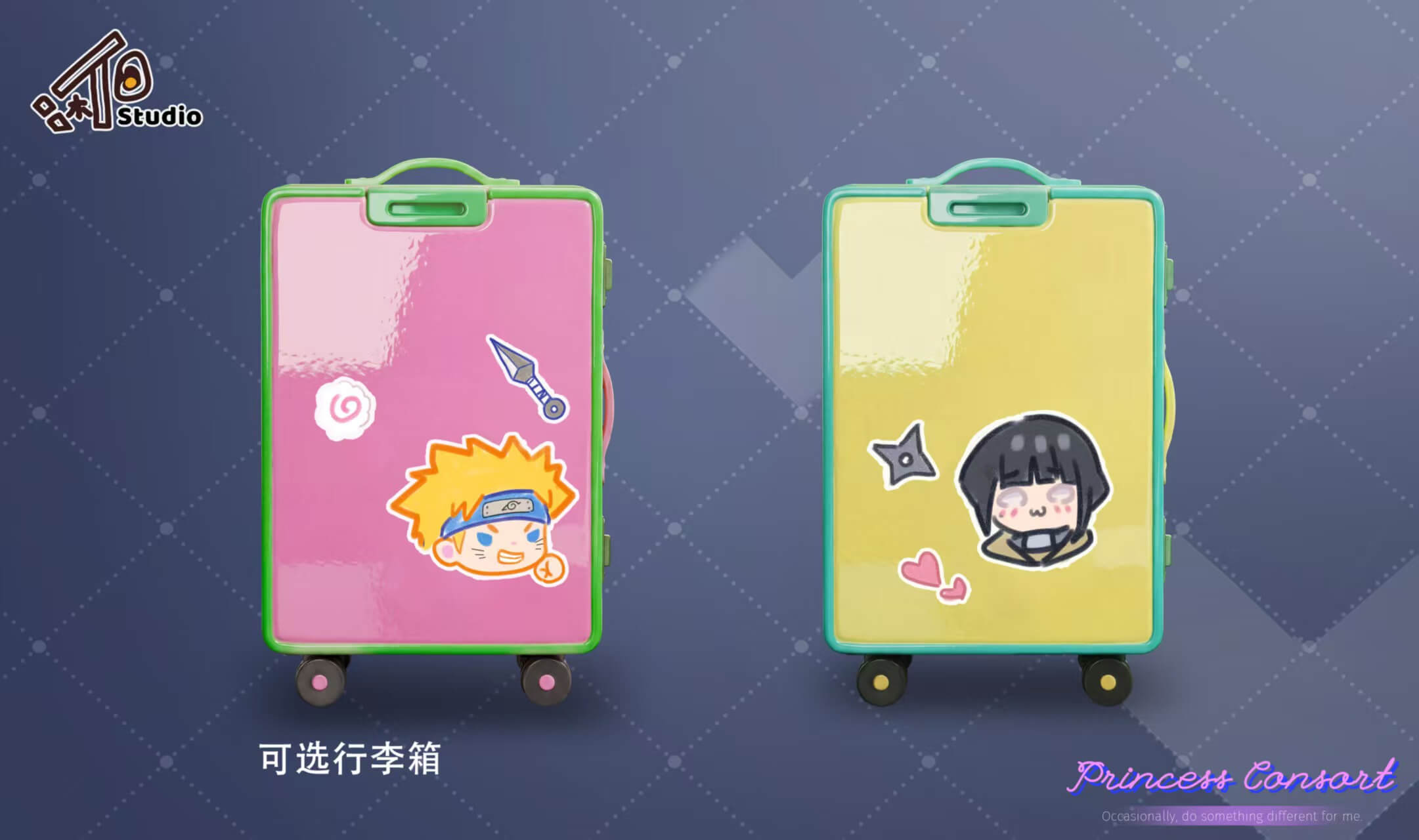 - Luggage base (selectable): pink version decorated with chibi Naruto sticker and kunai/swirl decals, or yellow version decorated with chibi Hinata sticker and shuriken/heart decals — each telling its own small story about the pairing