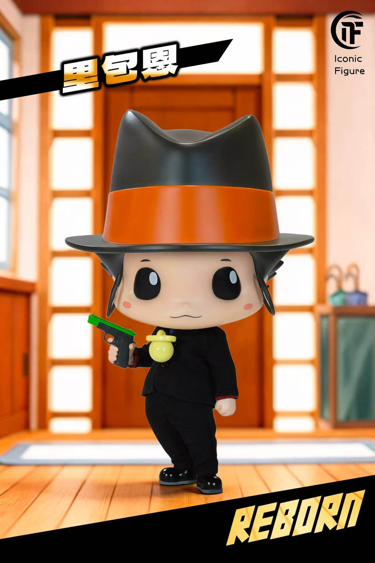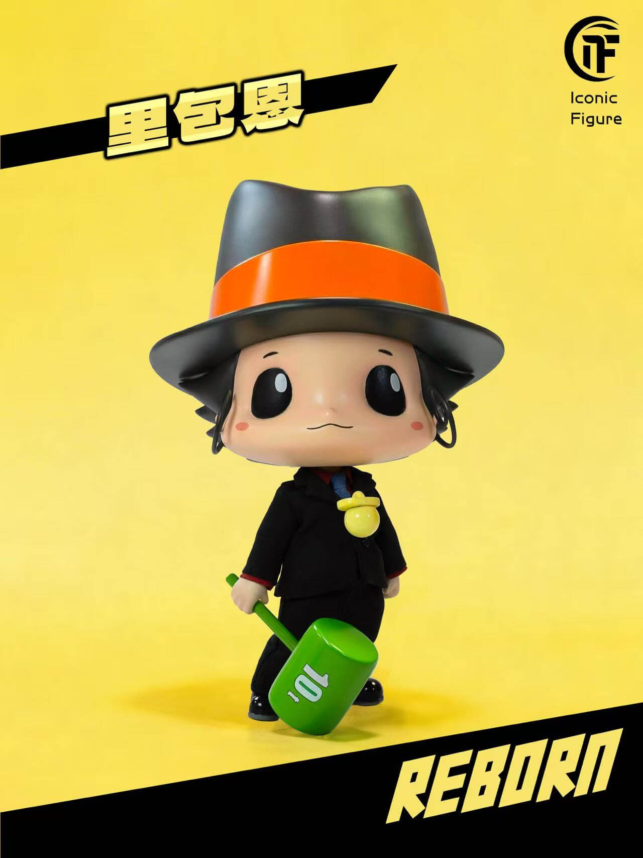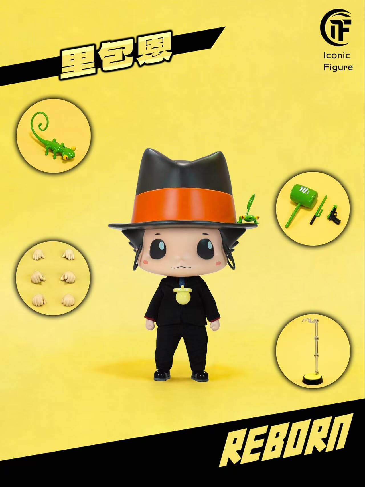- × 1 head sculpt — that signature deadpan expression rendered in chibi proportion, with the oversized fedora and sideburn curl faithfully intact