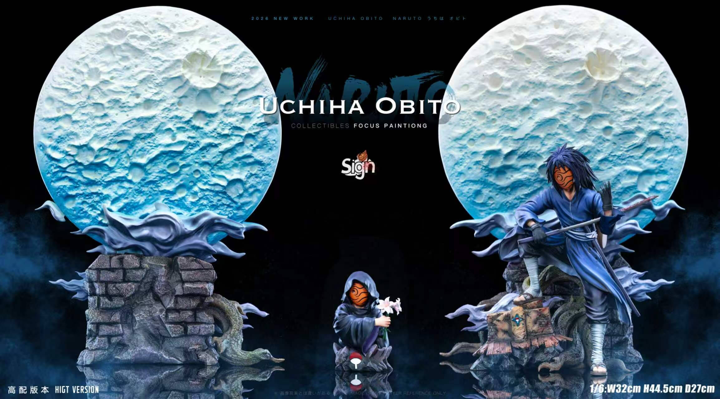 The Deluxe Version transforms the display entirely: the 32 cm textured moon looms behind Obito and shifts between cold lunar white and blood red at the press of a button, reframing the same sculpt as two distinct emotional statements without any repositioning.