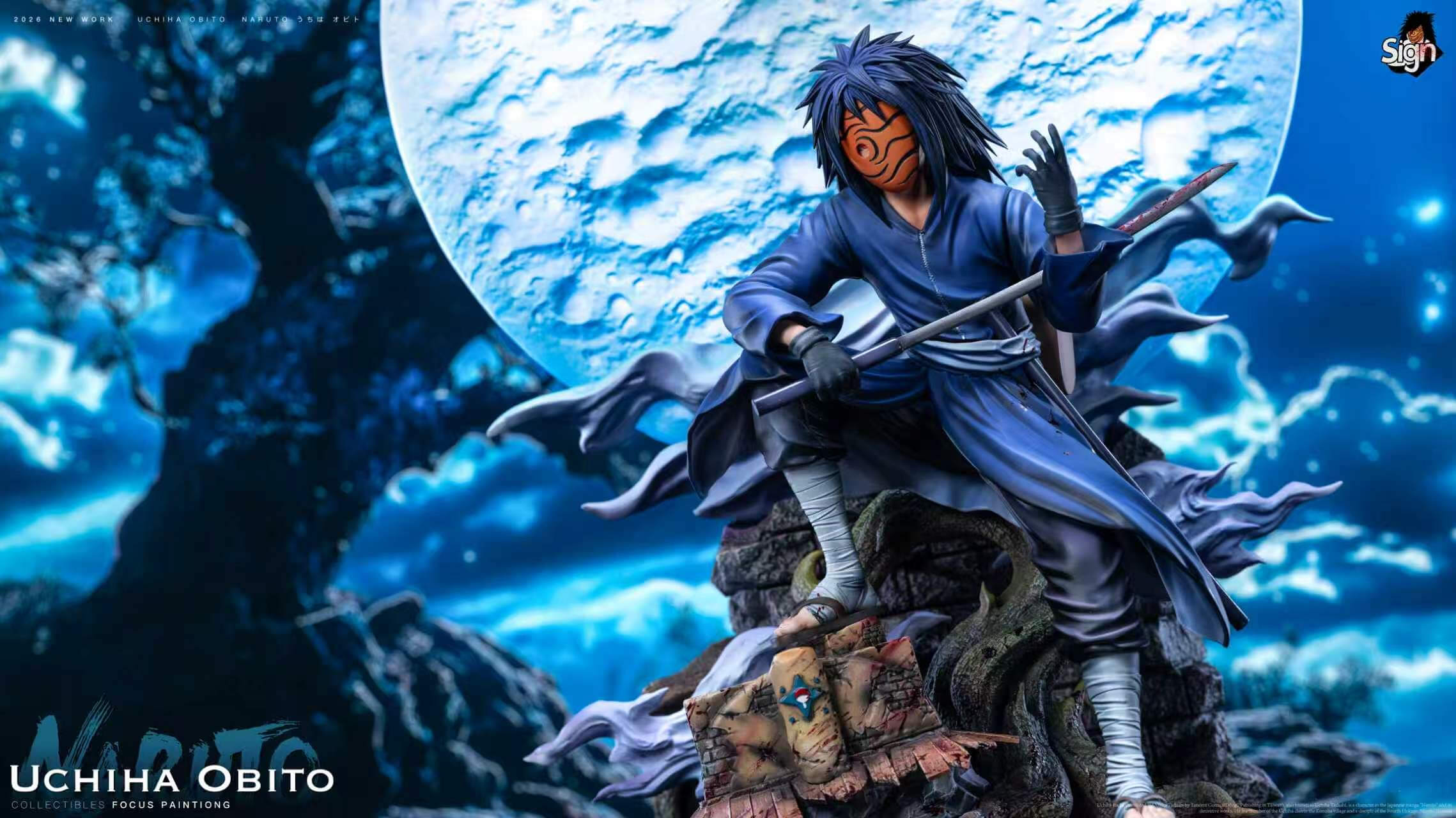 - Main figure — Obito crouched low on a shattered battlefield base, robes mid-billow, metal weapon in hand