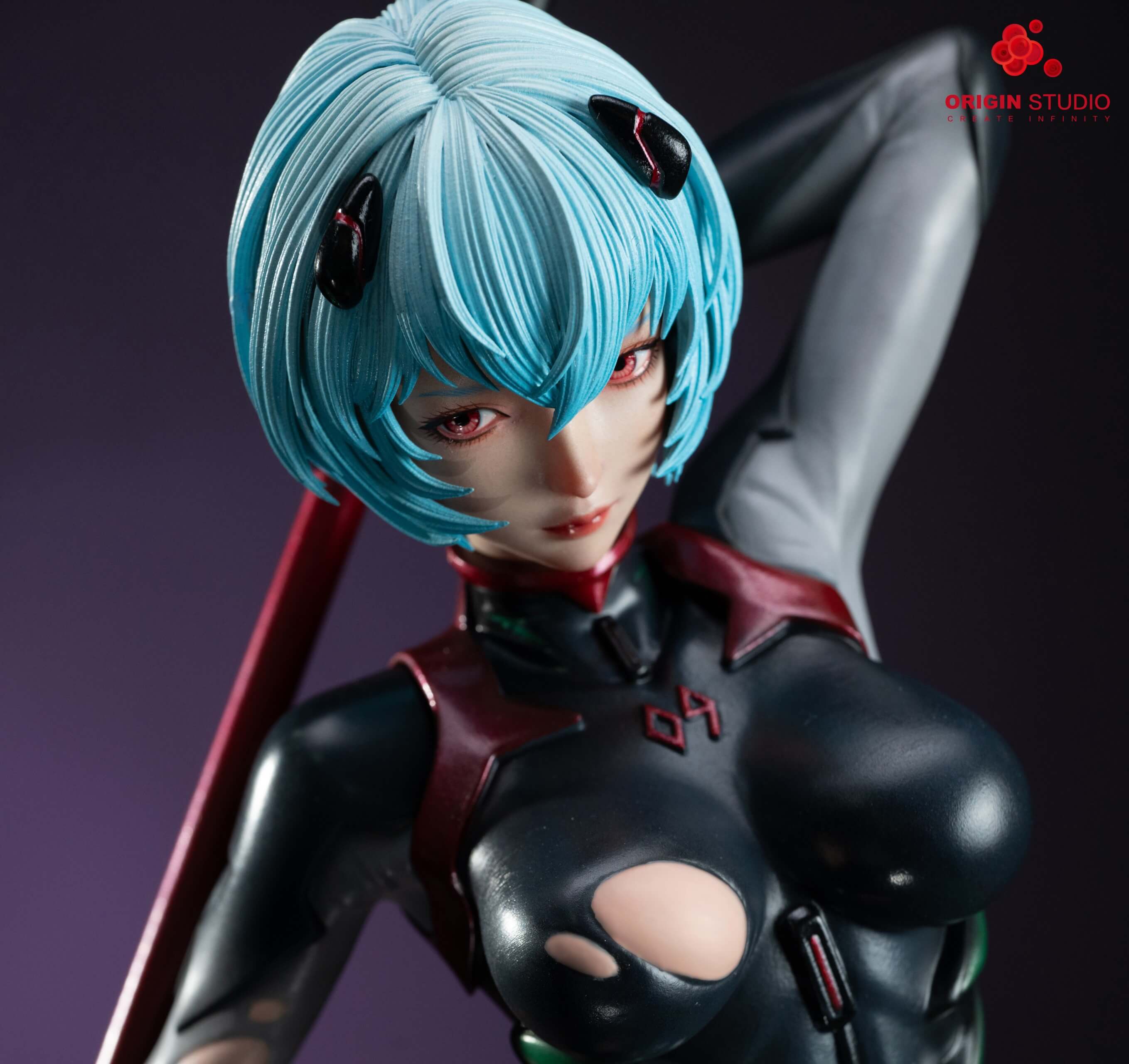 - Rei Ayanami in a battle-worn black plugsuit