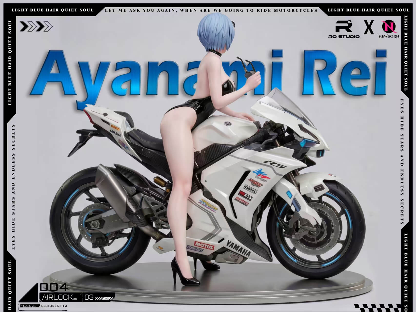 - 1/4 scale figure of Rei Ayanami seated and posed alongside a race-spec Yamaha sportbike — the composition reads as a full diorama straight out of the box