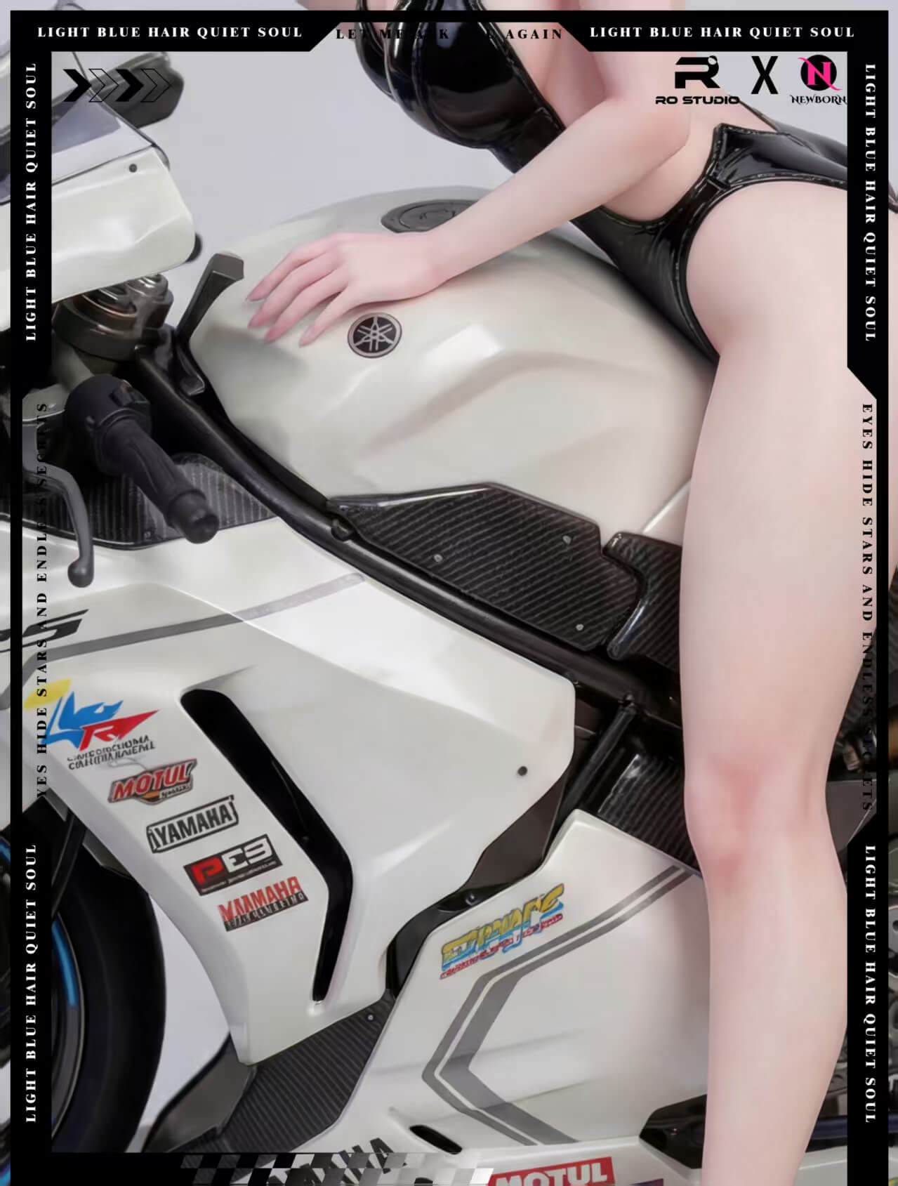 - Yamaha R-series sportbike rendered with racing livery, sponsor decals, carbon fiber panel detailing, and blue-accented wheels — each element treated with the same care as the figure itself
