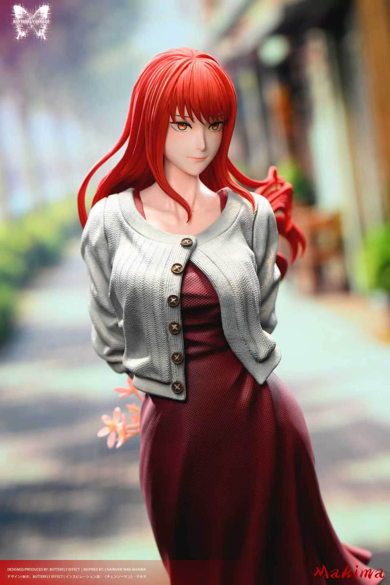 • × 1 character statue in signature outfit — Reze in her casual streetwear with satchel; Makima in her iconic cardigan-and-dress ensemble holding flowers