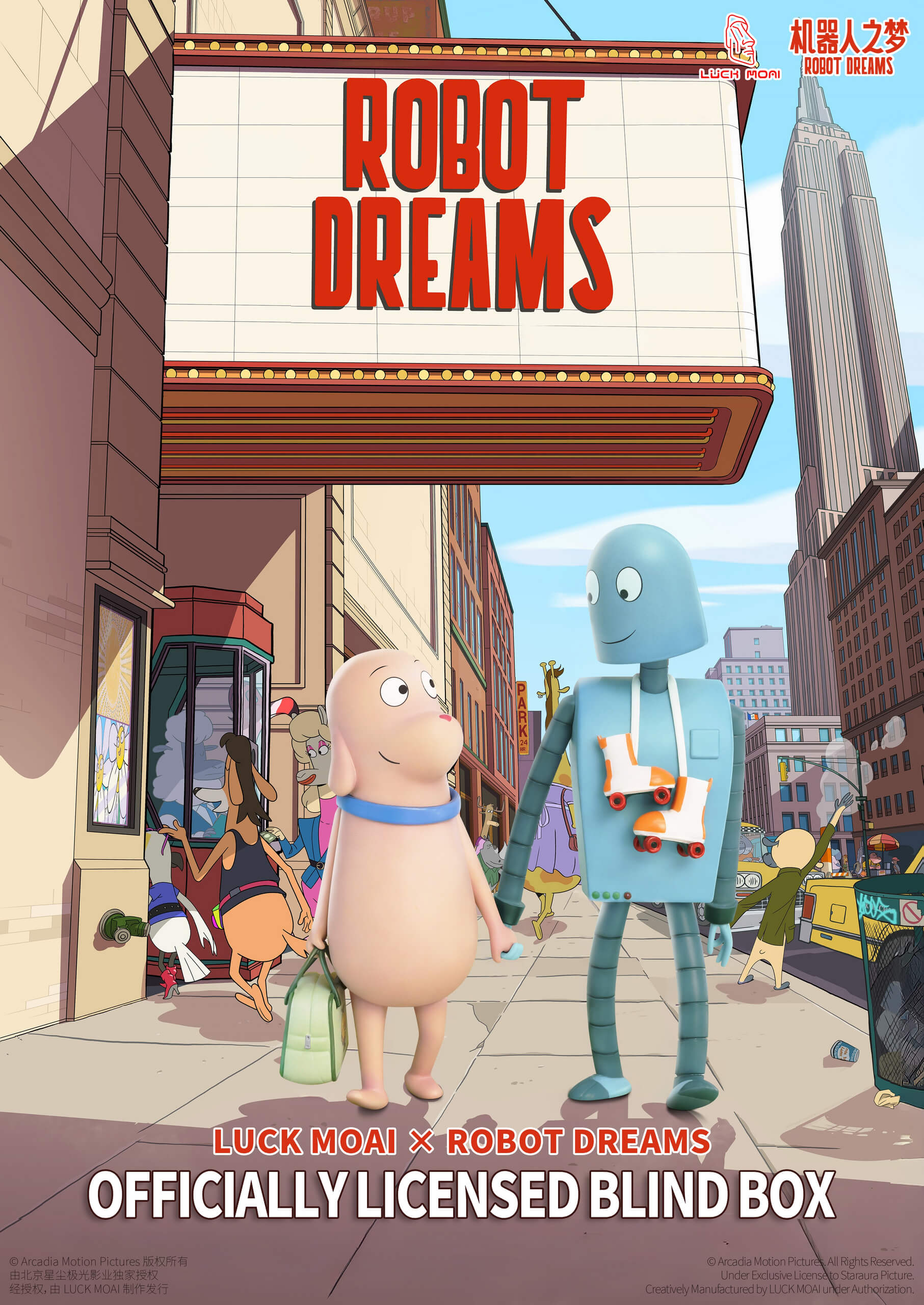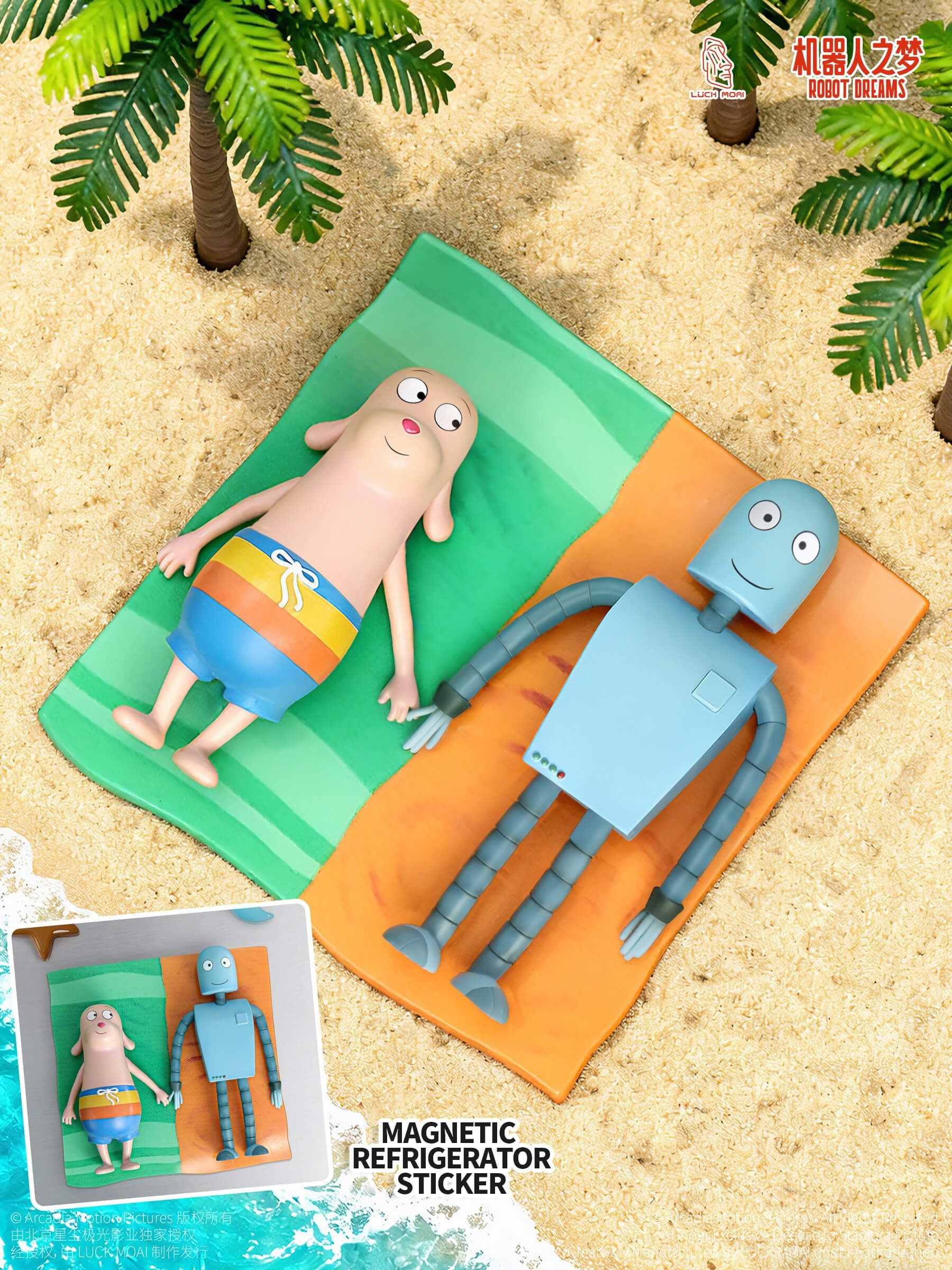 - Magnetic refrigerator sticker included with the beach towel design, reproducing Dog and Robot standing side by side