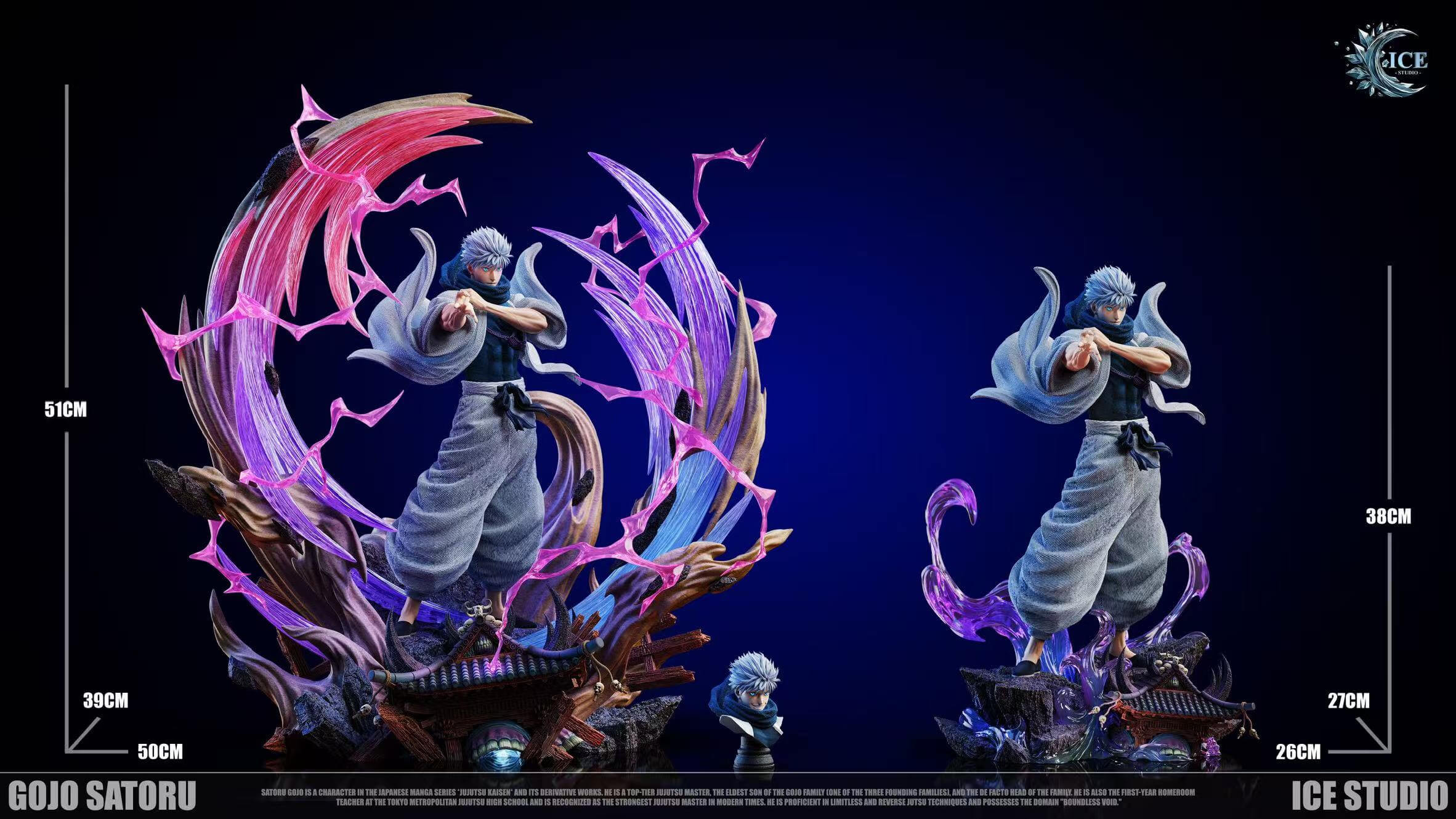 What the Deluxe adds: The expanded base transforms the piece from a dynamic figure into a full diorama — the crumbling temple rooftiles, erupting purple energy pillar, and surrounding cursed-spirit atmosphere give Gojo a world to dominate rather than simply stand in.
