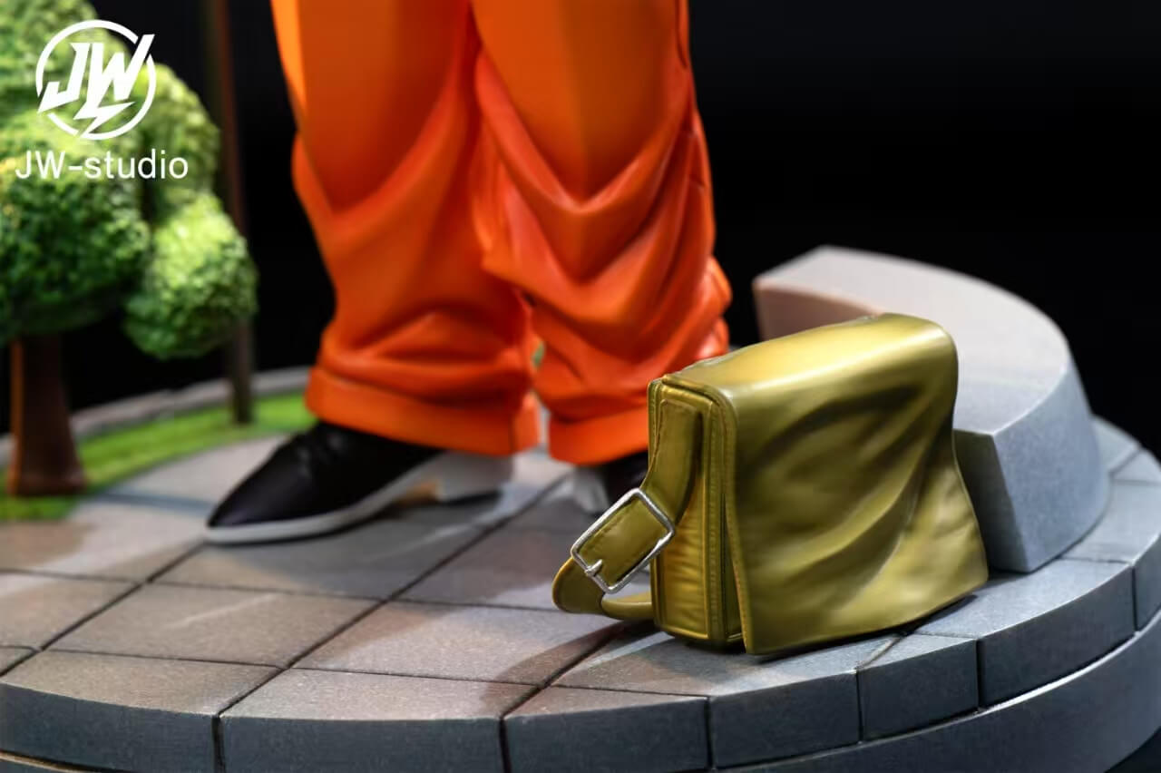 - Full figure of Son Gohan in his iconic high school civilian outfit โ white long-sleeve shirt, black vest with Orange Star High School badge, orange trousers, and black sneakers