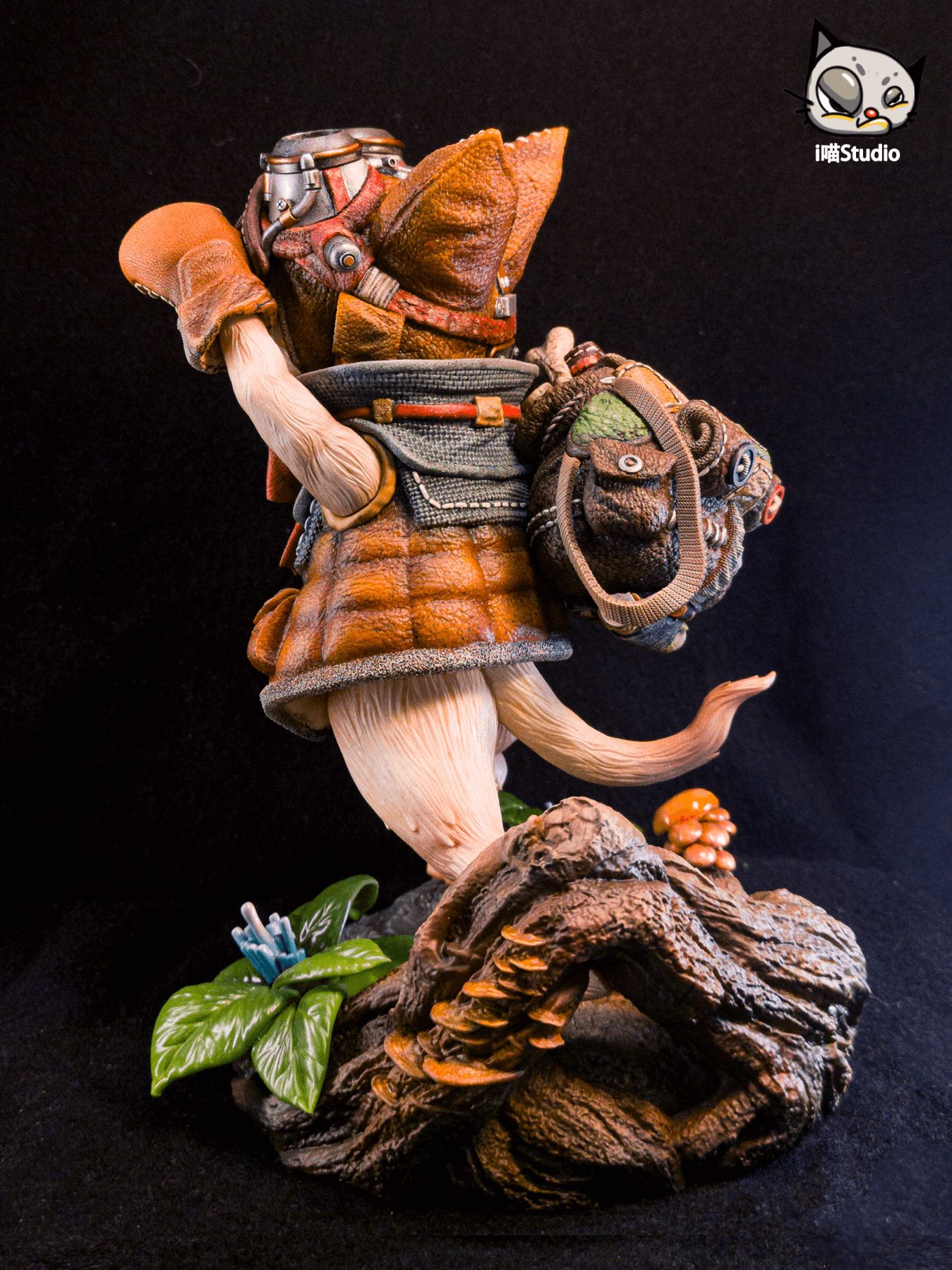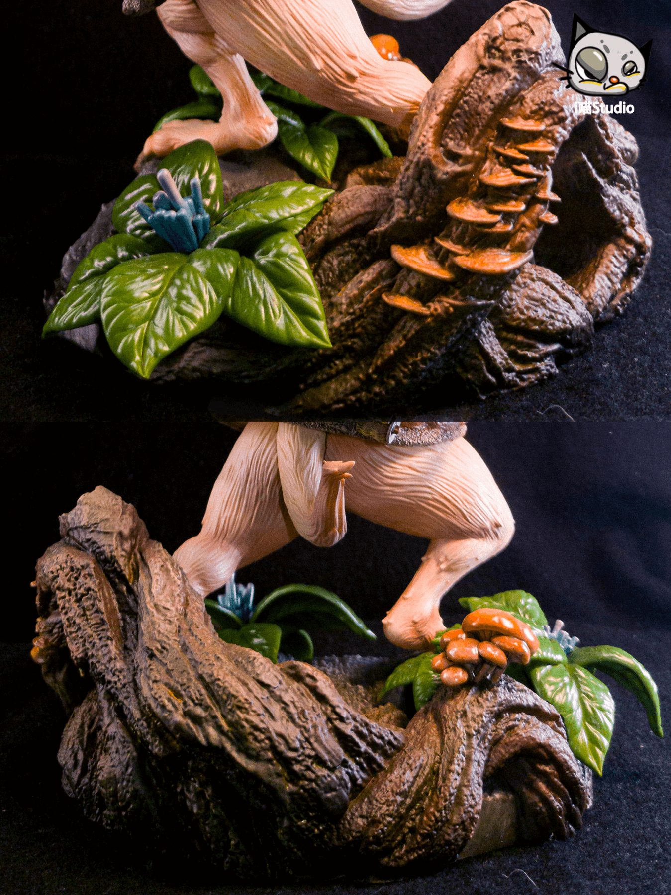 - Textured forest-floor diorama base with mushrooms and foliage