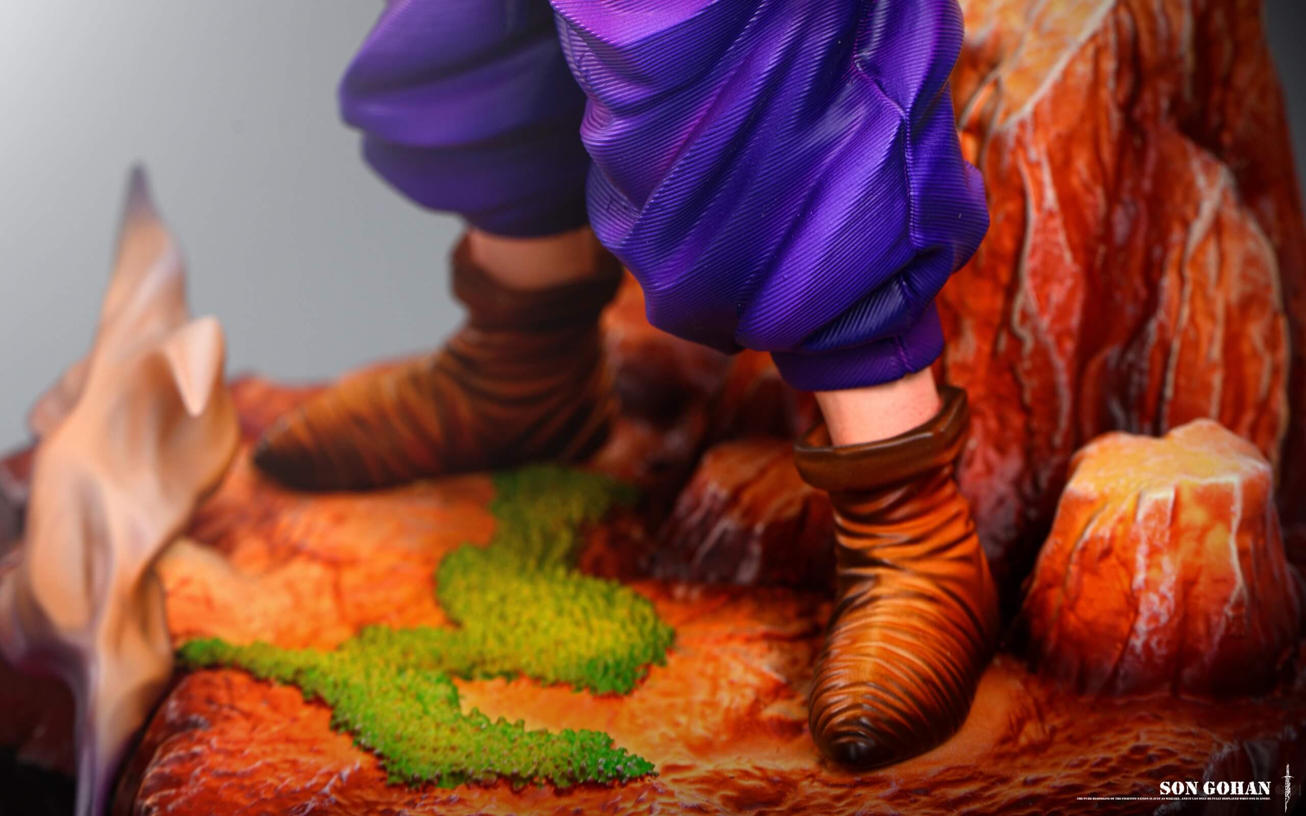 - Intricately sculpted battle-damaged gi with torn purple pants and a textured scarf-style mantle.