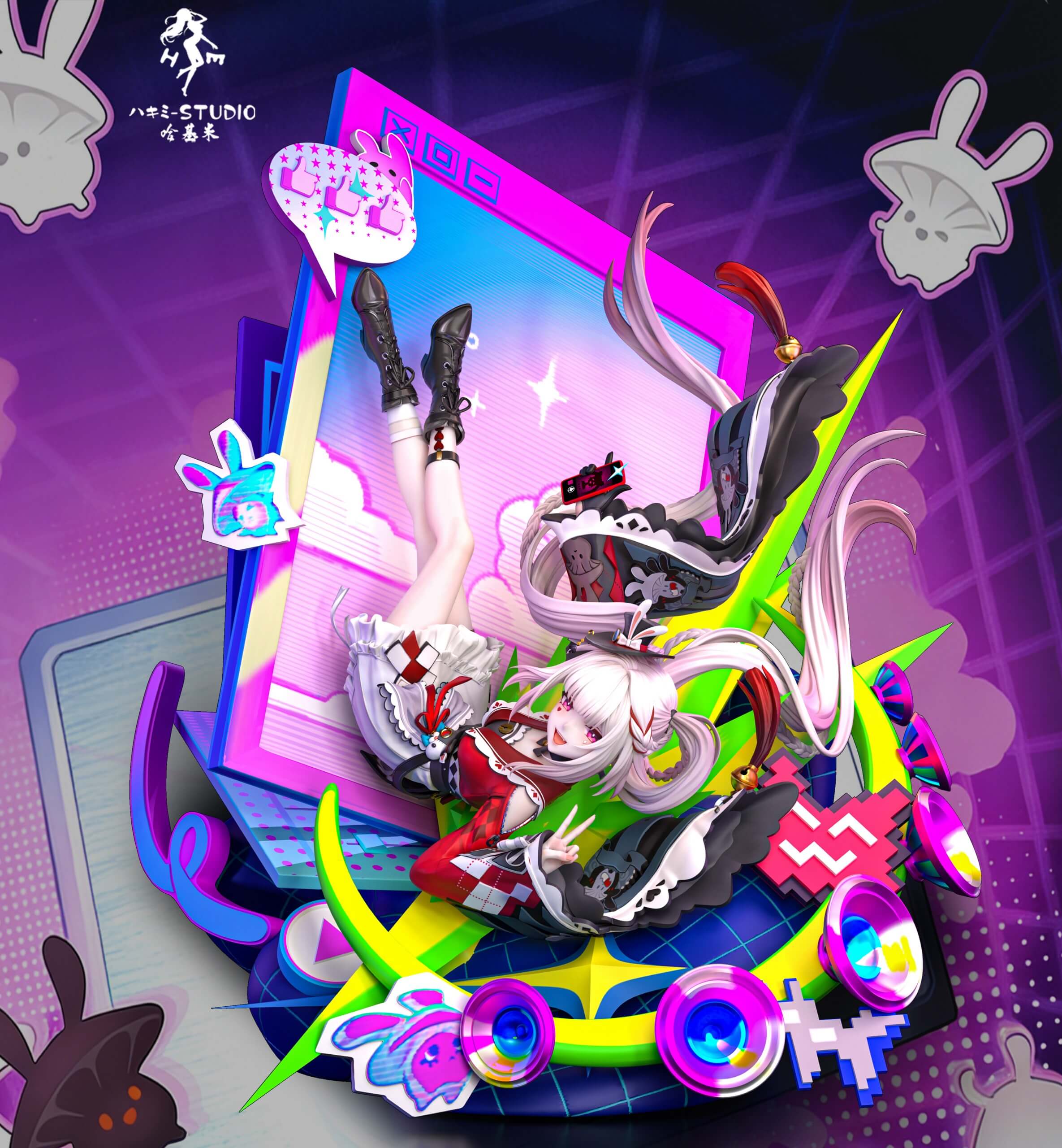 - Multiple floating accessories including pixelated speech bubbles, bunny-ear stickers, oversized sneakers, camera, and vibrant geometric elements
