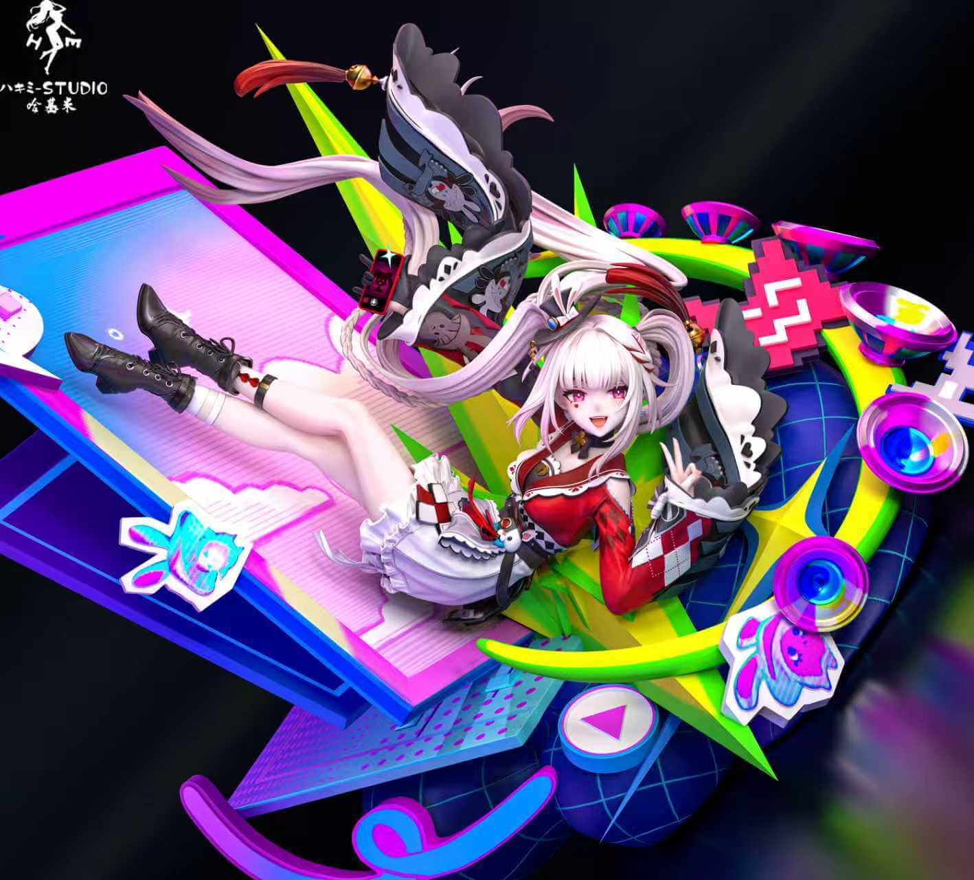 - Signature long twin-tailed white-pink hair with red accents and elaborate jester-style hat featuring black wings and bells