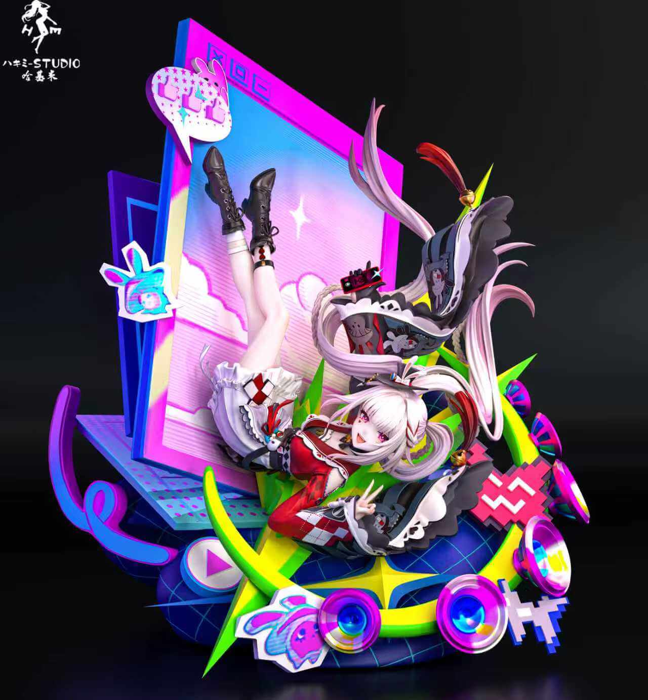 - Highly detailed multi-layered base with neon speakers, star shapes, and cyber-jester motifs