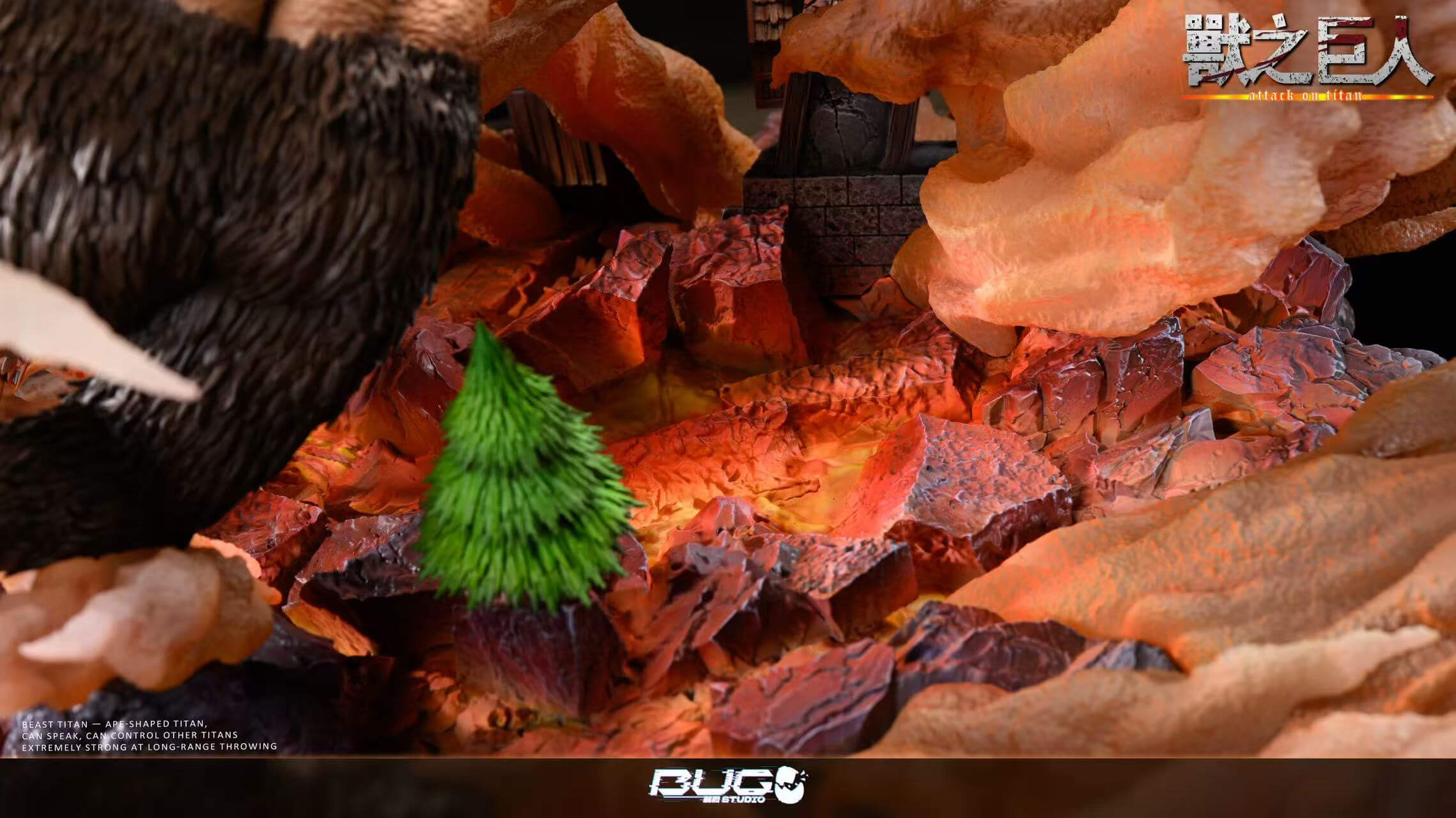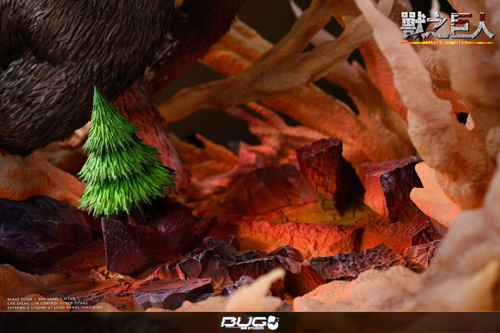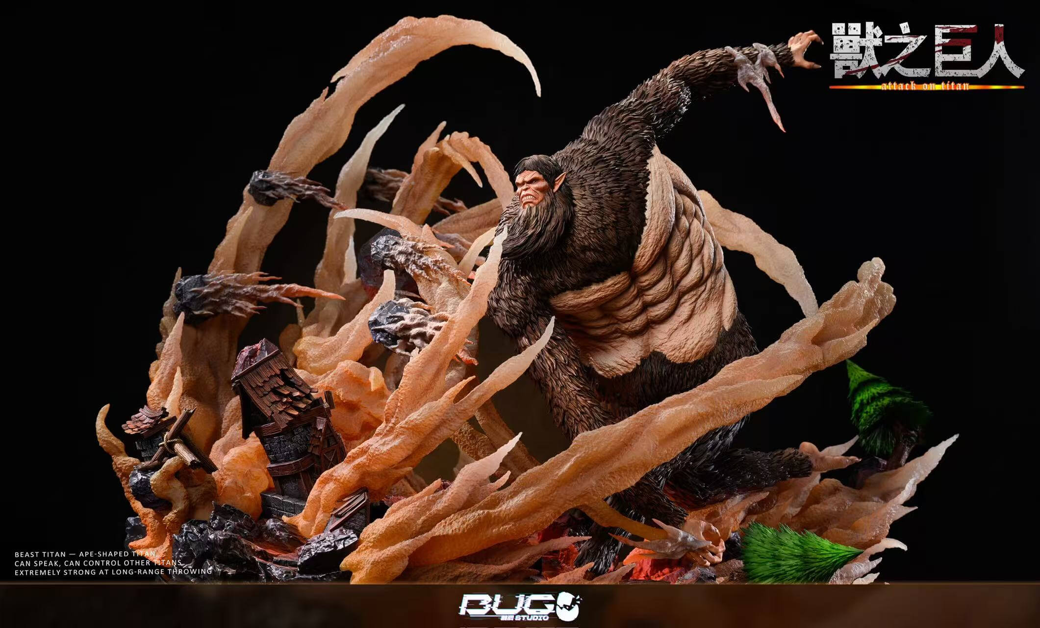 - Large Beast Titan figure — the dominant centerpiece, colossal frame mid-hurl with every strand of dark fur individually textured