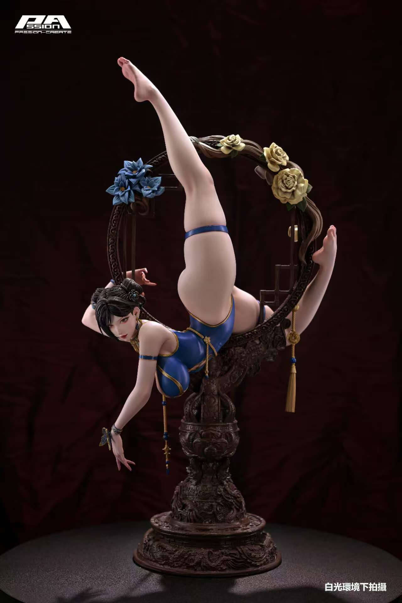 - Full figure sculpt โ Chun-Li posed mid-aerial kick, body fully extended with one leg raised high, capturing the explosive momentum of her signature Hyakuretsukyaku sequence