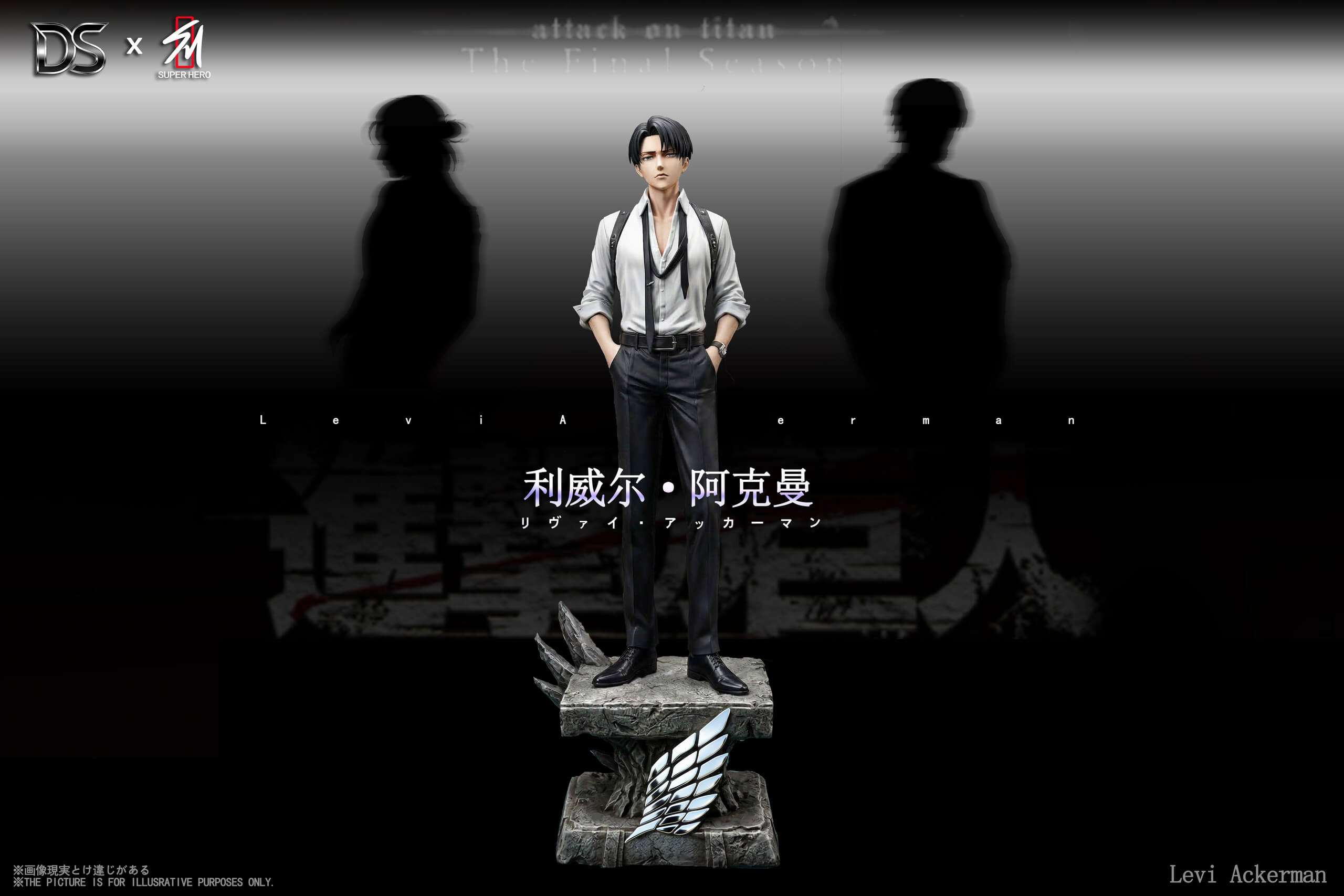 - Single standing figure of Levi Ackerman in dress shirt, suspenders, and tailored trousers โ hands in pockets, composed and commanding