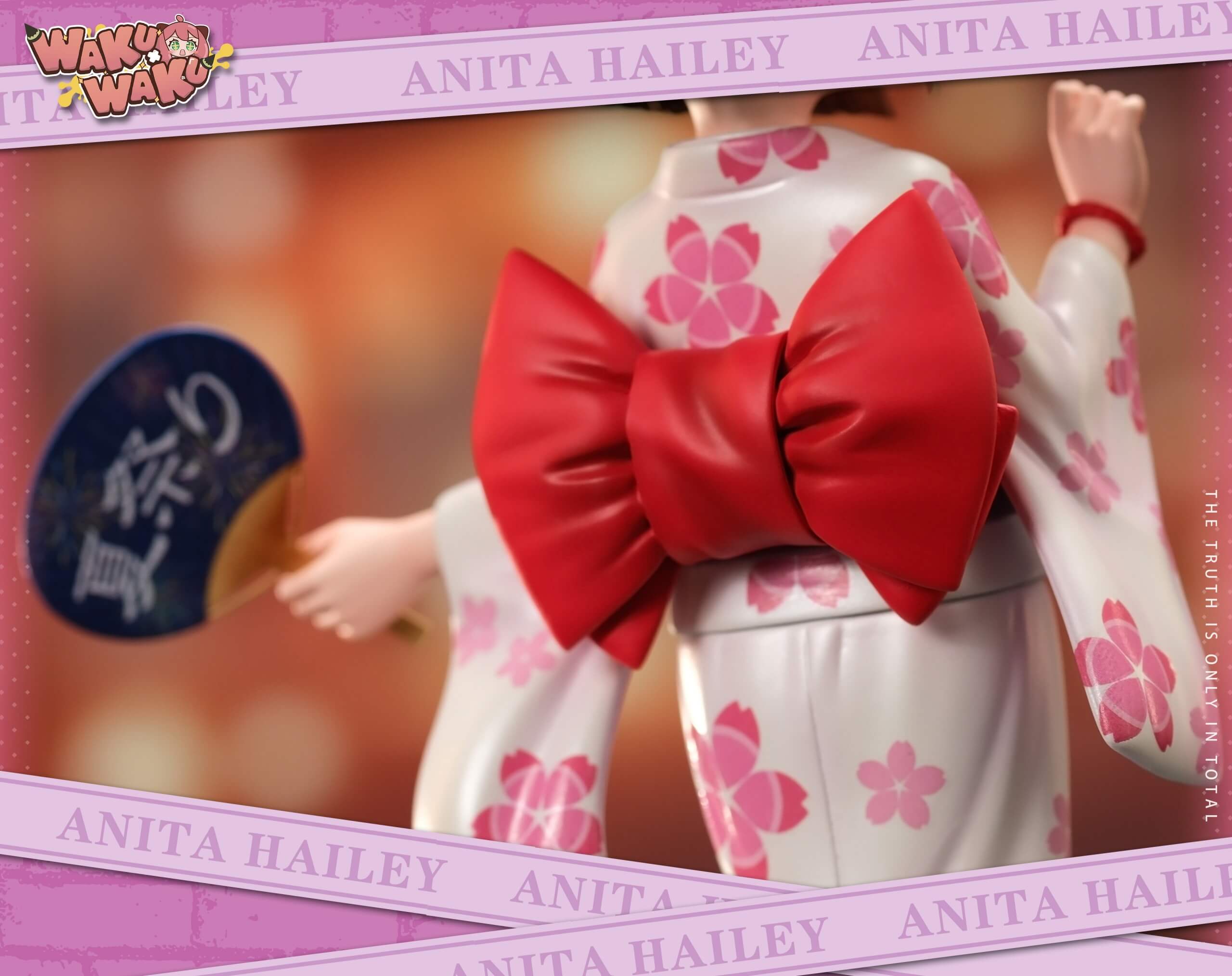 - Ai Haibara in a white yukata with pink sakura pattern, oversized red obi bow, and festival purse