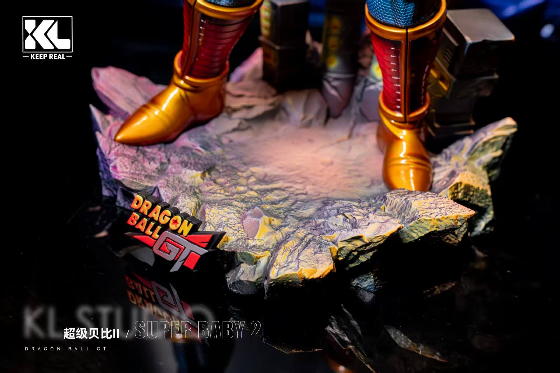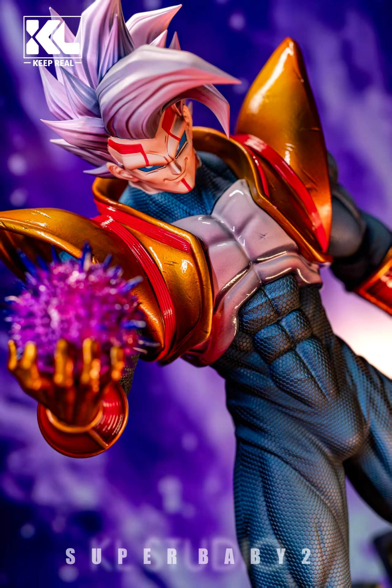 - Main figure — Super Baby 2 in a commanding forward stance, one hand extended and cradling a crackling sphere of dark energy, the other trailing at his side with fingers slightly curled
