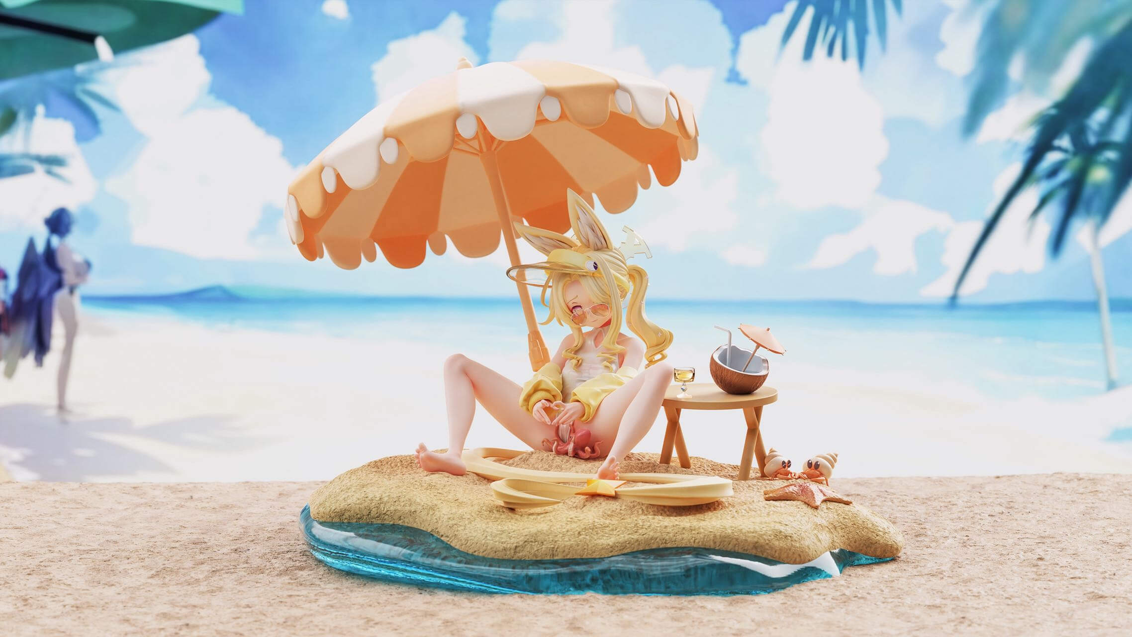 - Base accessories โ folding side table, coconut drink with straw and cocktail umbrella, stemmed glass