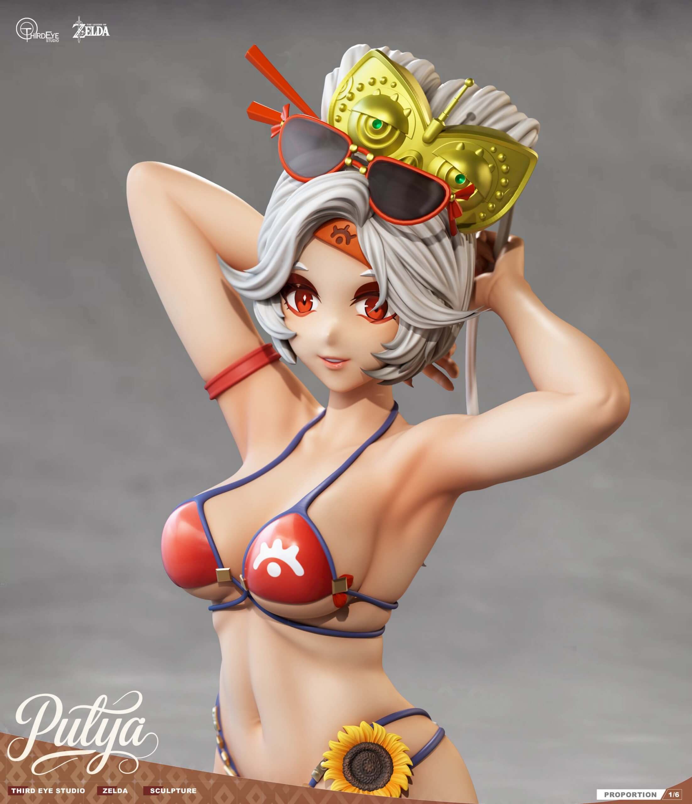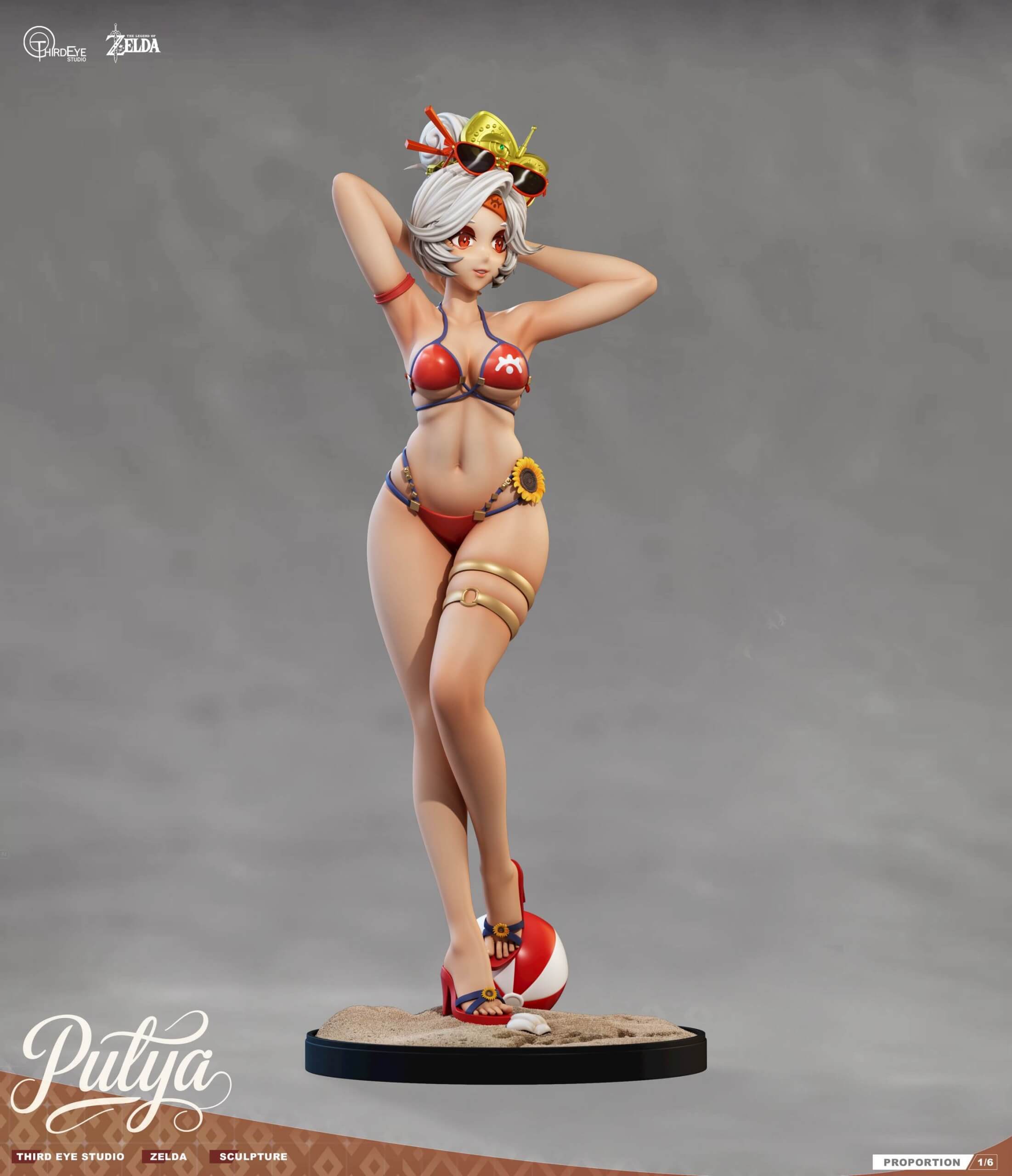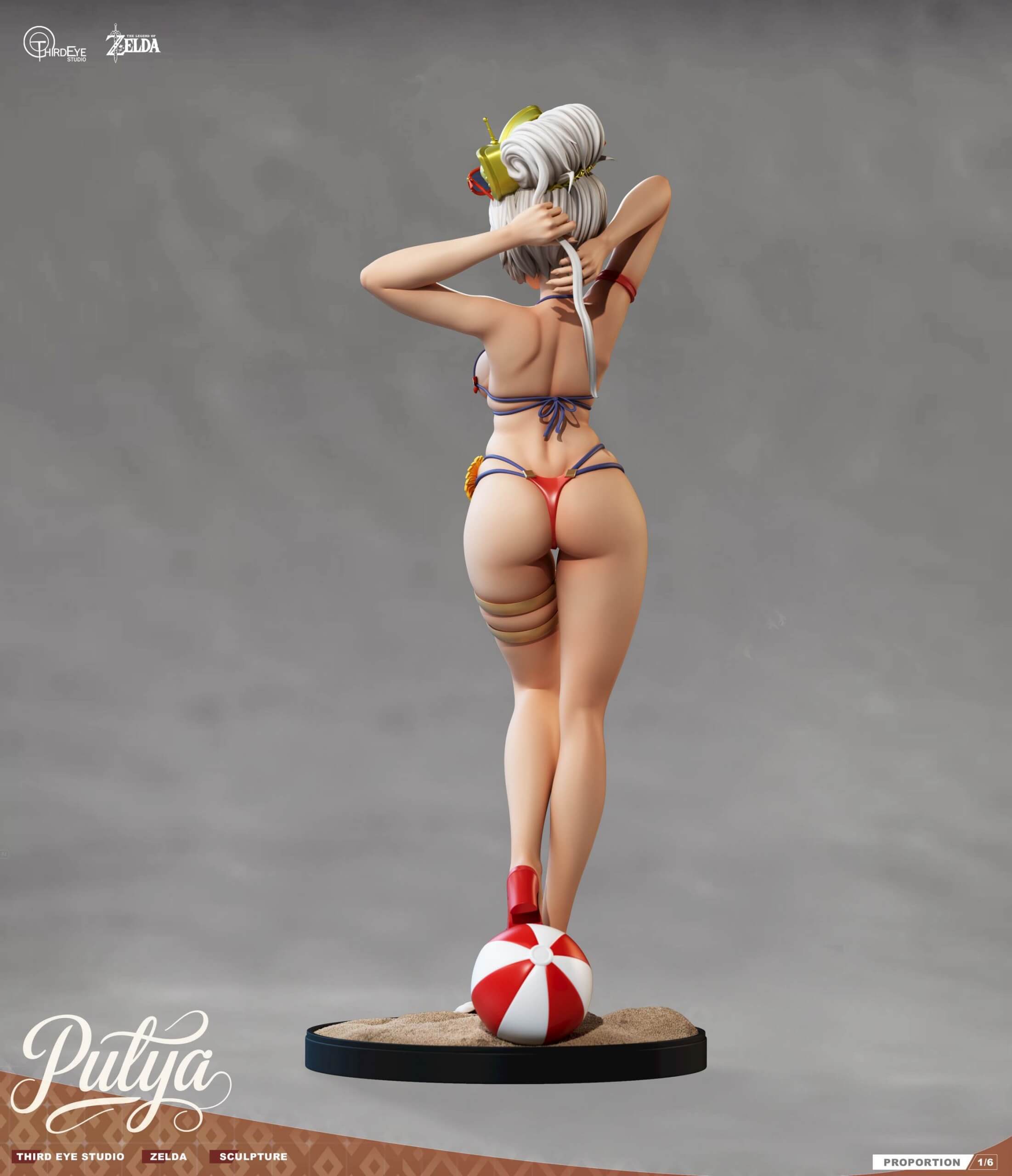 - Single full-body statue of Purah in a relaxed beach pose, with both hands lifting her hair behind her head.