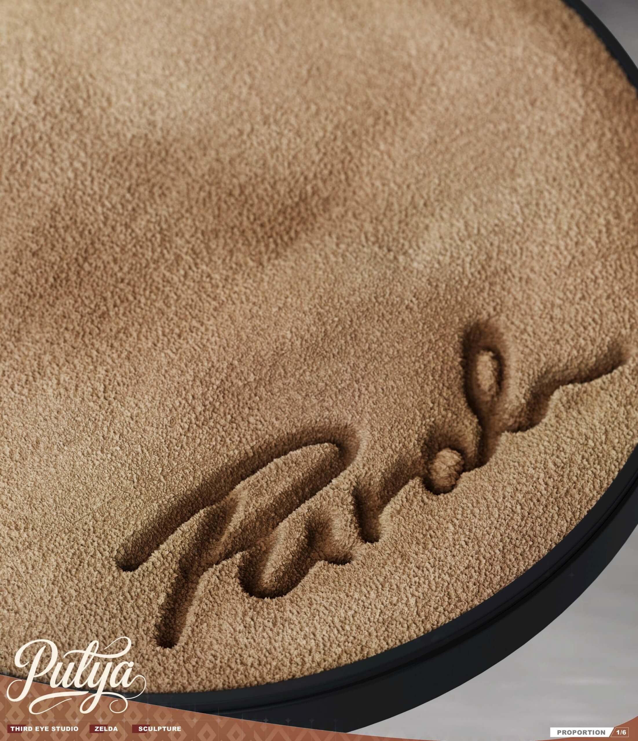 - Beach-themed base featuring textured sand and an engraved signature-style detail on the surface.