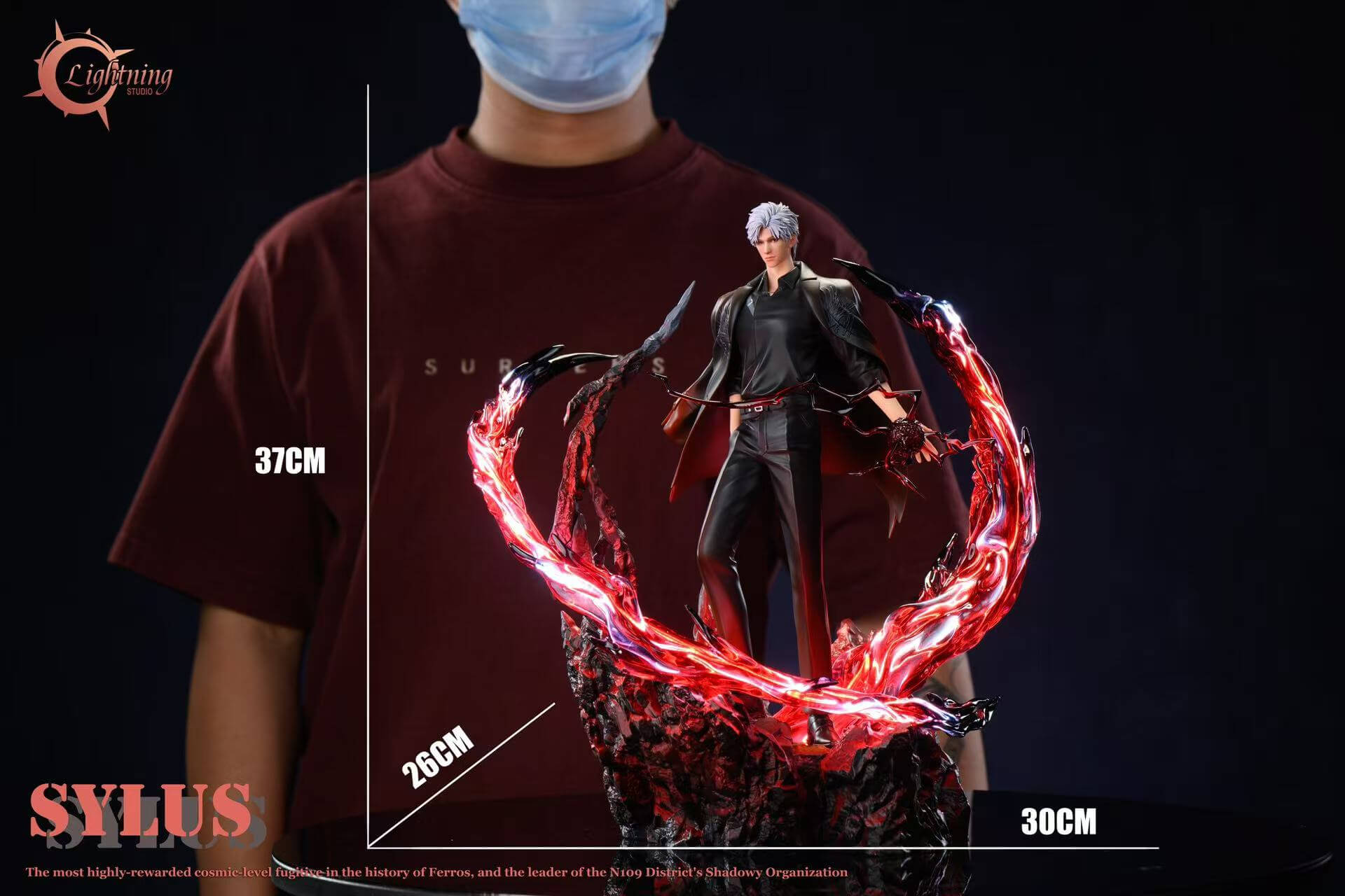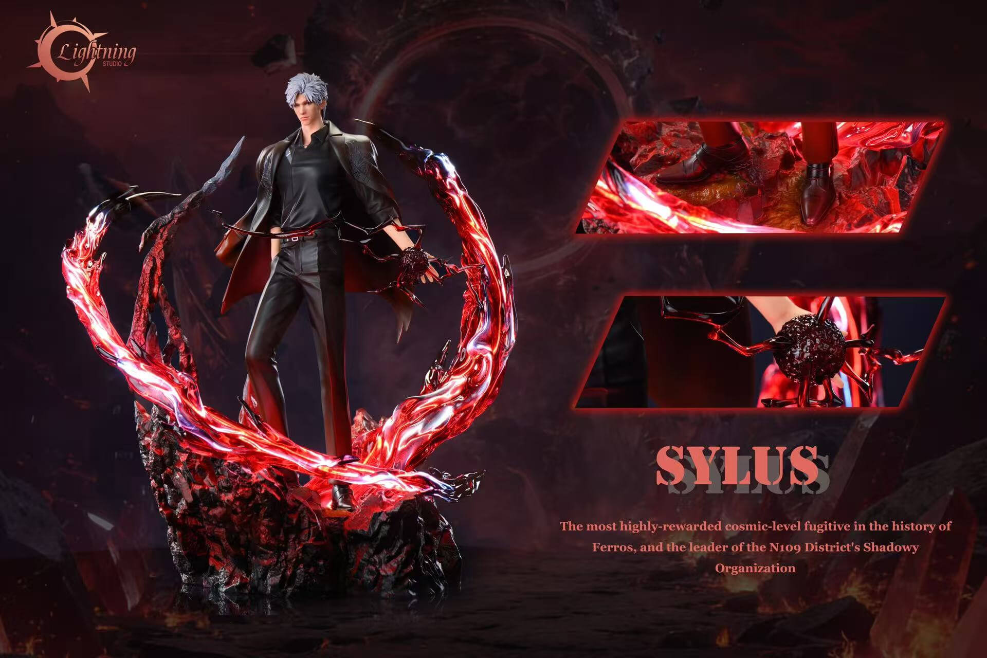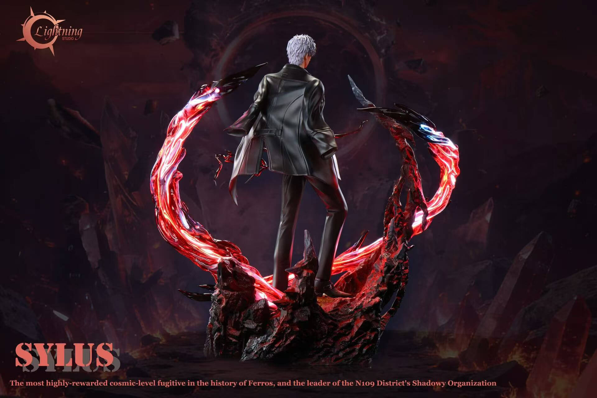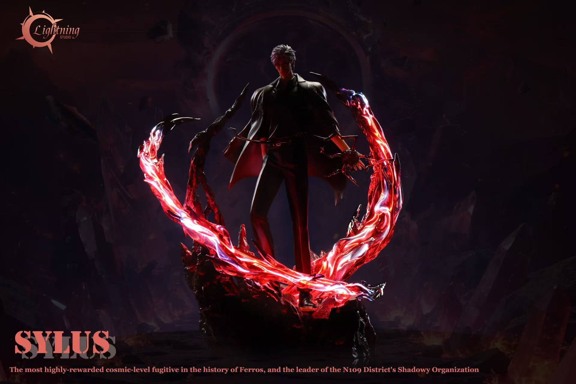 - Textured rocky base with integrated lighting โ illuminated from within, casting deep red ambient glow through the energy arcs and across the shattered terrain beneath his feet