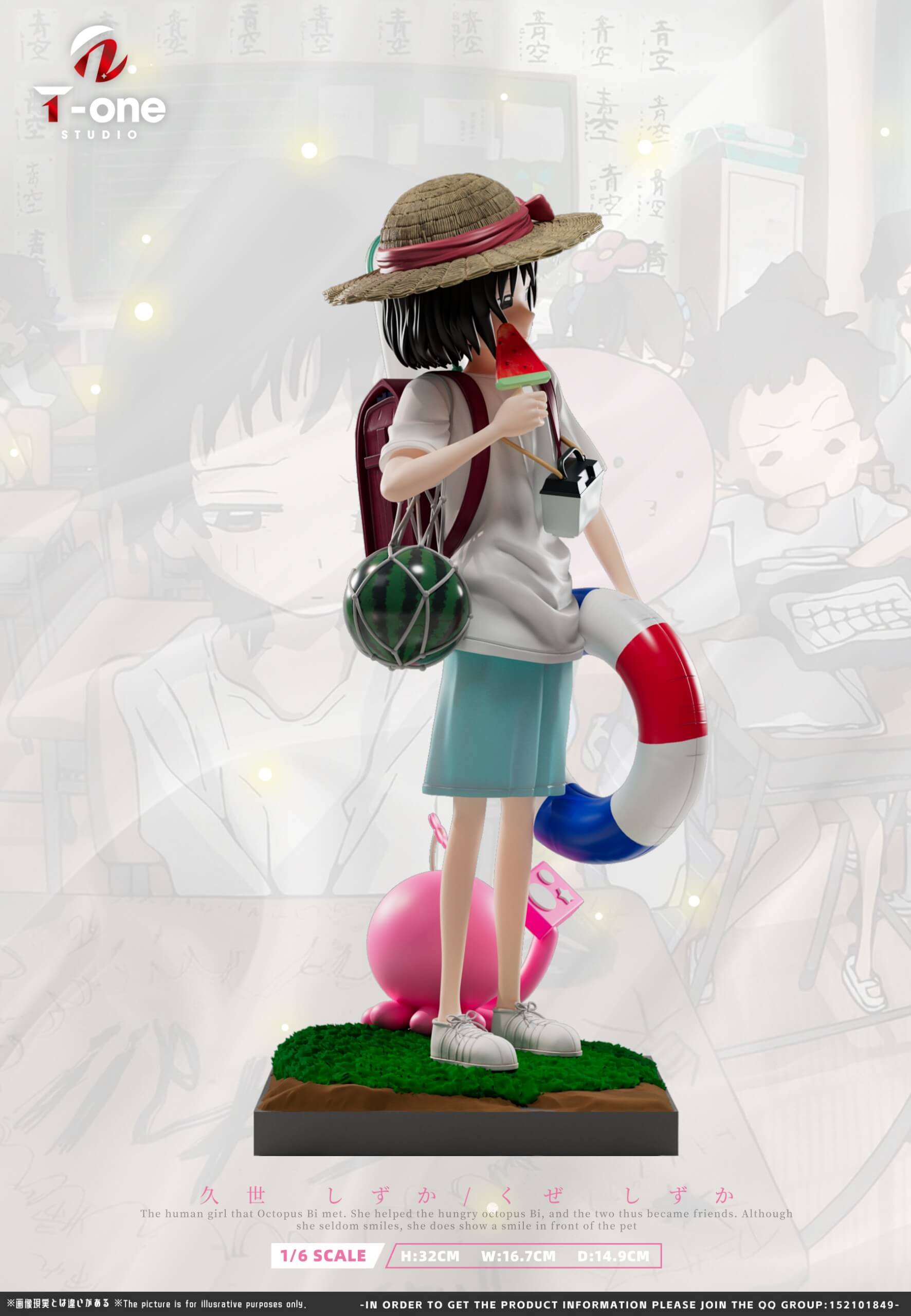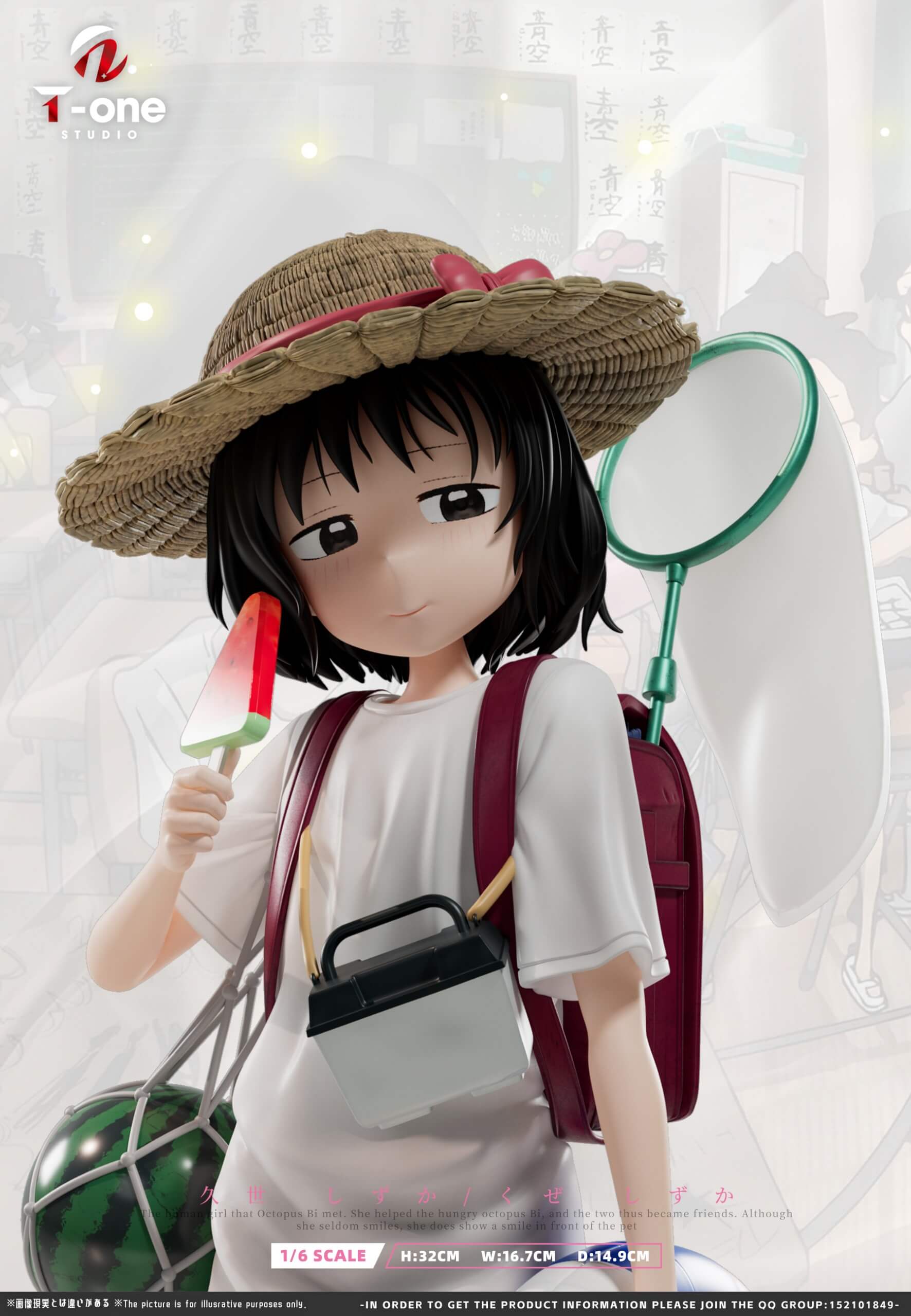 - Shizuka Kuze figure with a complete summer ensemble: straw hat, randoseru backpack, insect net, watermelon sling, camera, and lifebuoy