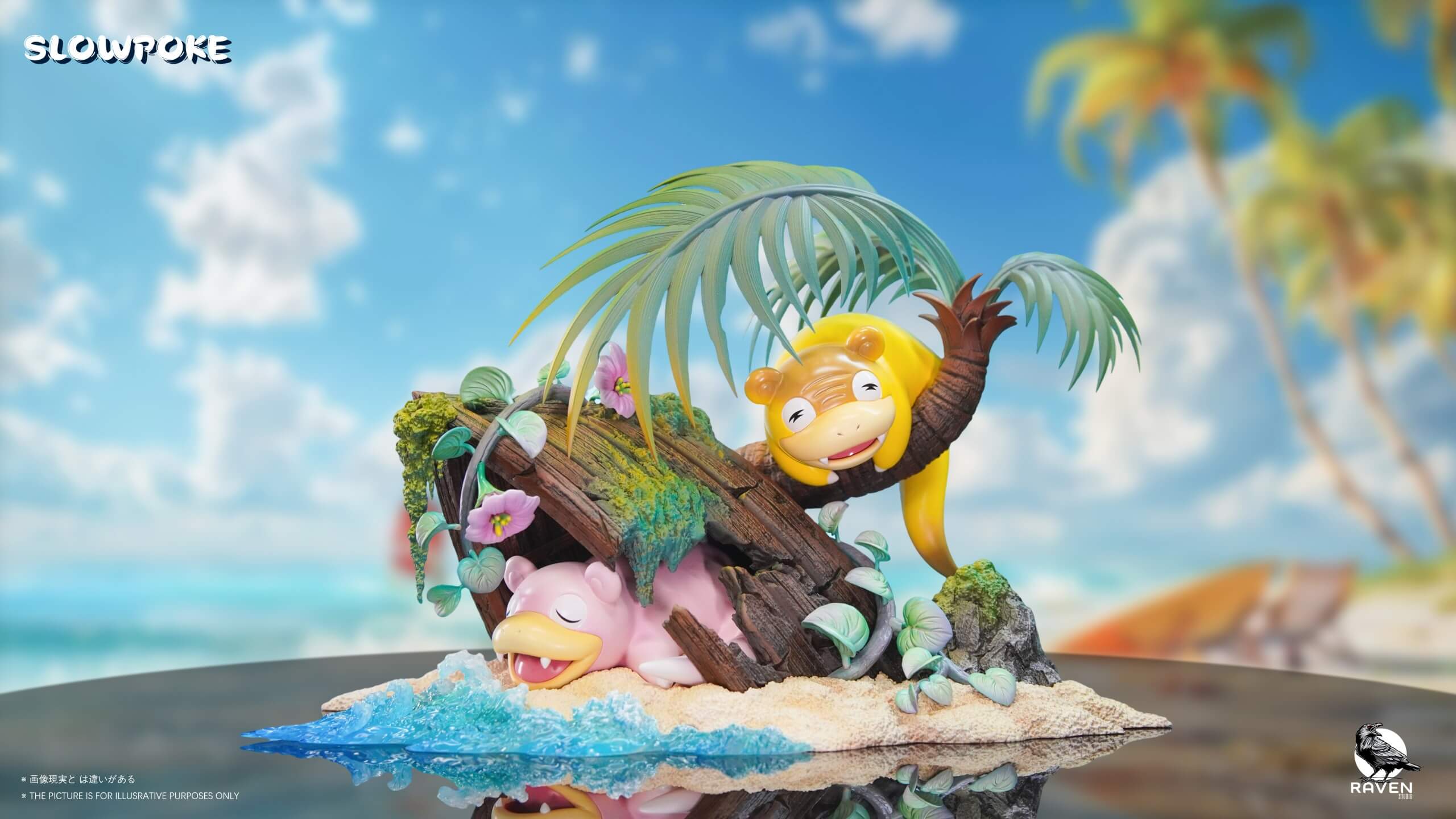 - Features a one-piece island diorama with two Slowpoke—one snoozing inside a driftwood hollow and the other draped over a palm trunk.