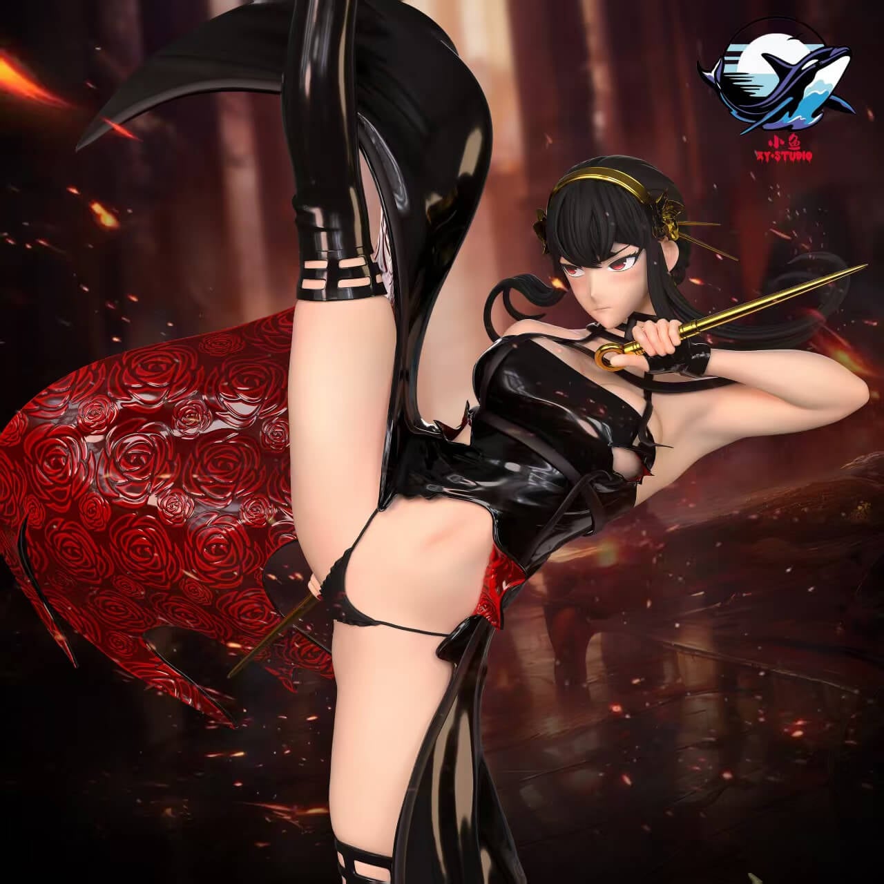 - Full figure of Yor Forger in her Thorn Princess assassin form โ leg raised mid-kick, golden hairpin needles fanned out, dual golden stiletto blades in hand